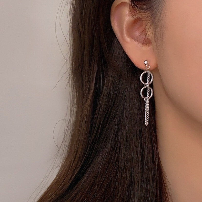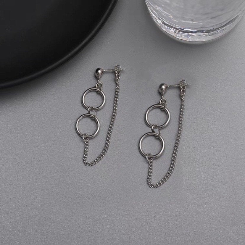 Aretes tipo stud con diseño de doble aro enlazado y cadena delgada. Su estilo minimalista con acabado plateado combina elegancia y modernidad, ideales para complementar cualquier look.