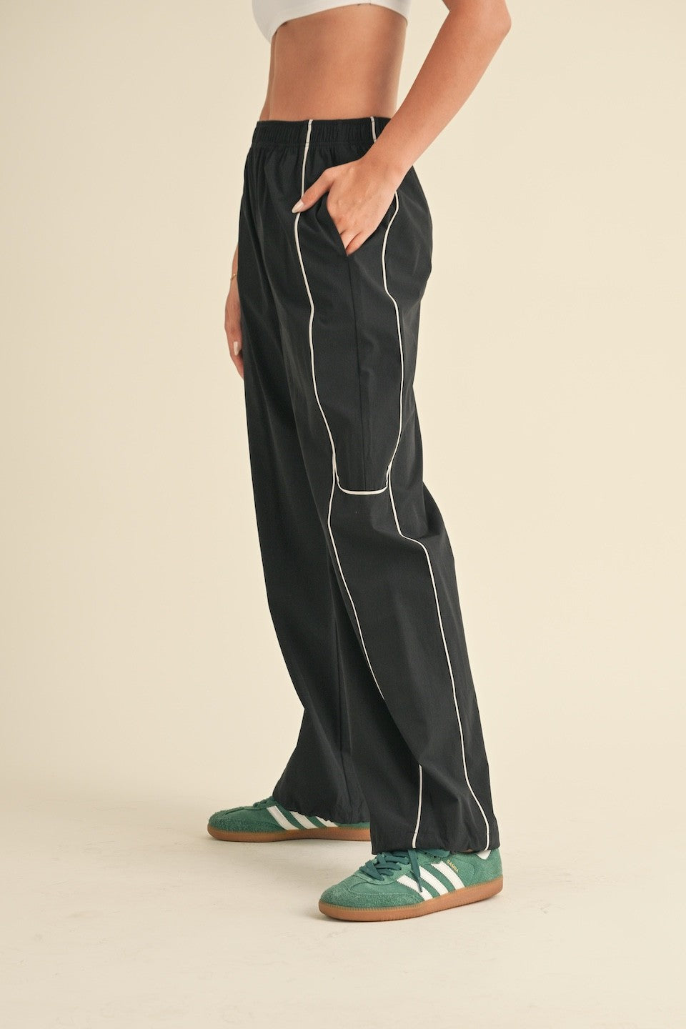 • Pantalones deportivos confeccionados en nylon con detalles de piping en contraste y tobillos ajustables con cordón. Combinan estilo moderno y comodidad, ideales para actividades deportivas o looks casuales con actitud deportiva.