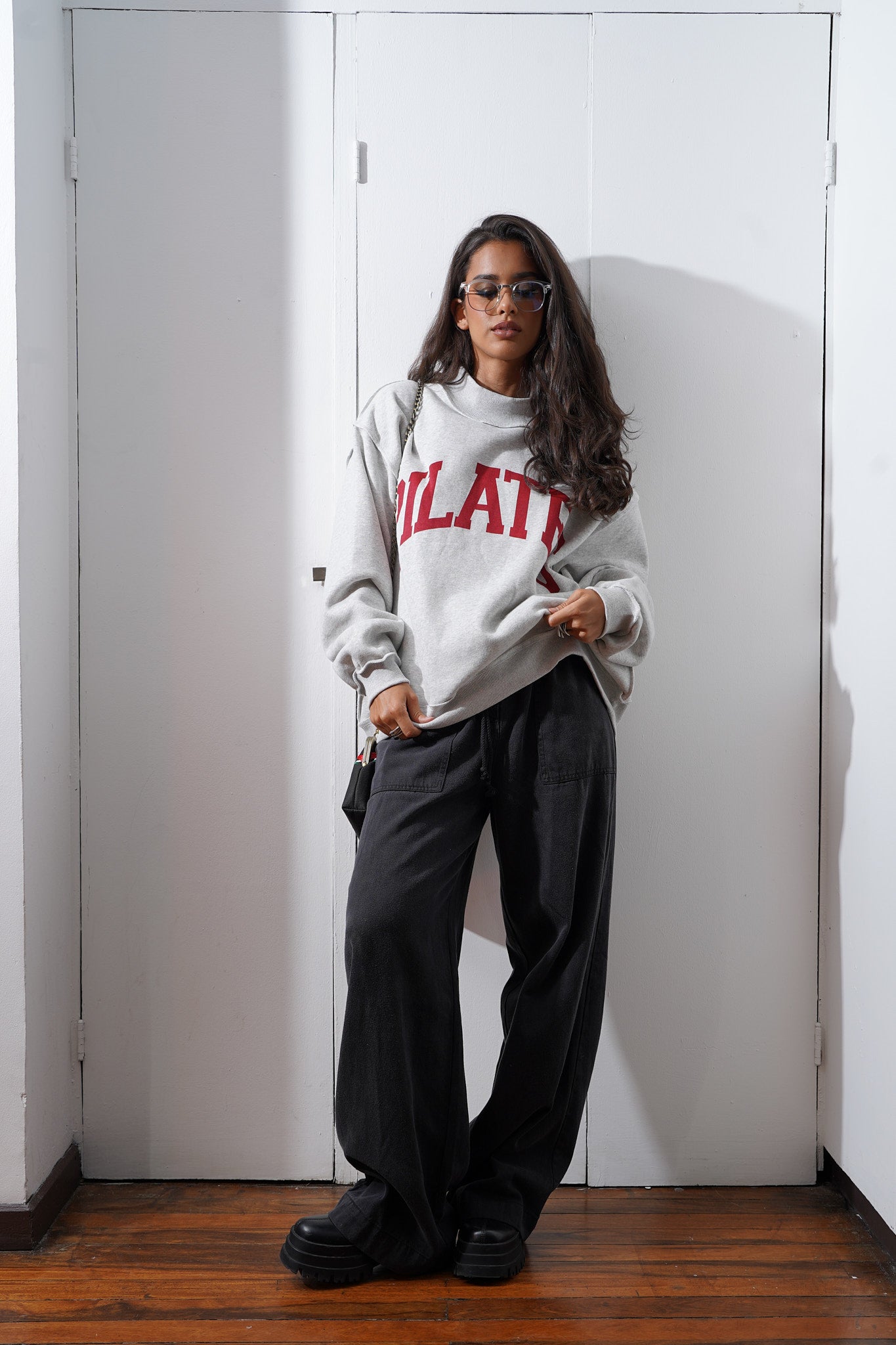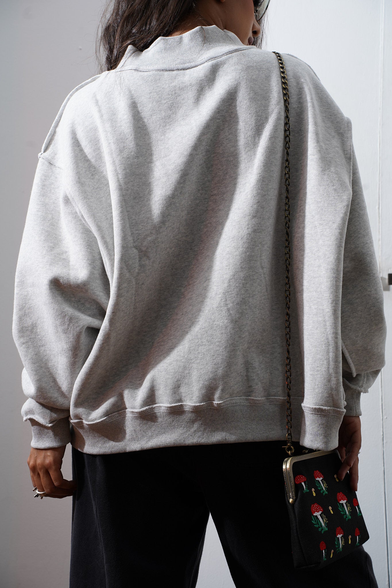 Sudadera reversible de cuello alto con hombros caídos y mangas largas. Confeccionada en felpa suave y cómoda, de corte oversize, con ribetes en puños y dobladillo. Diseño reversible que permite cambiar de estilo fácilmente.