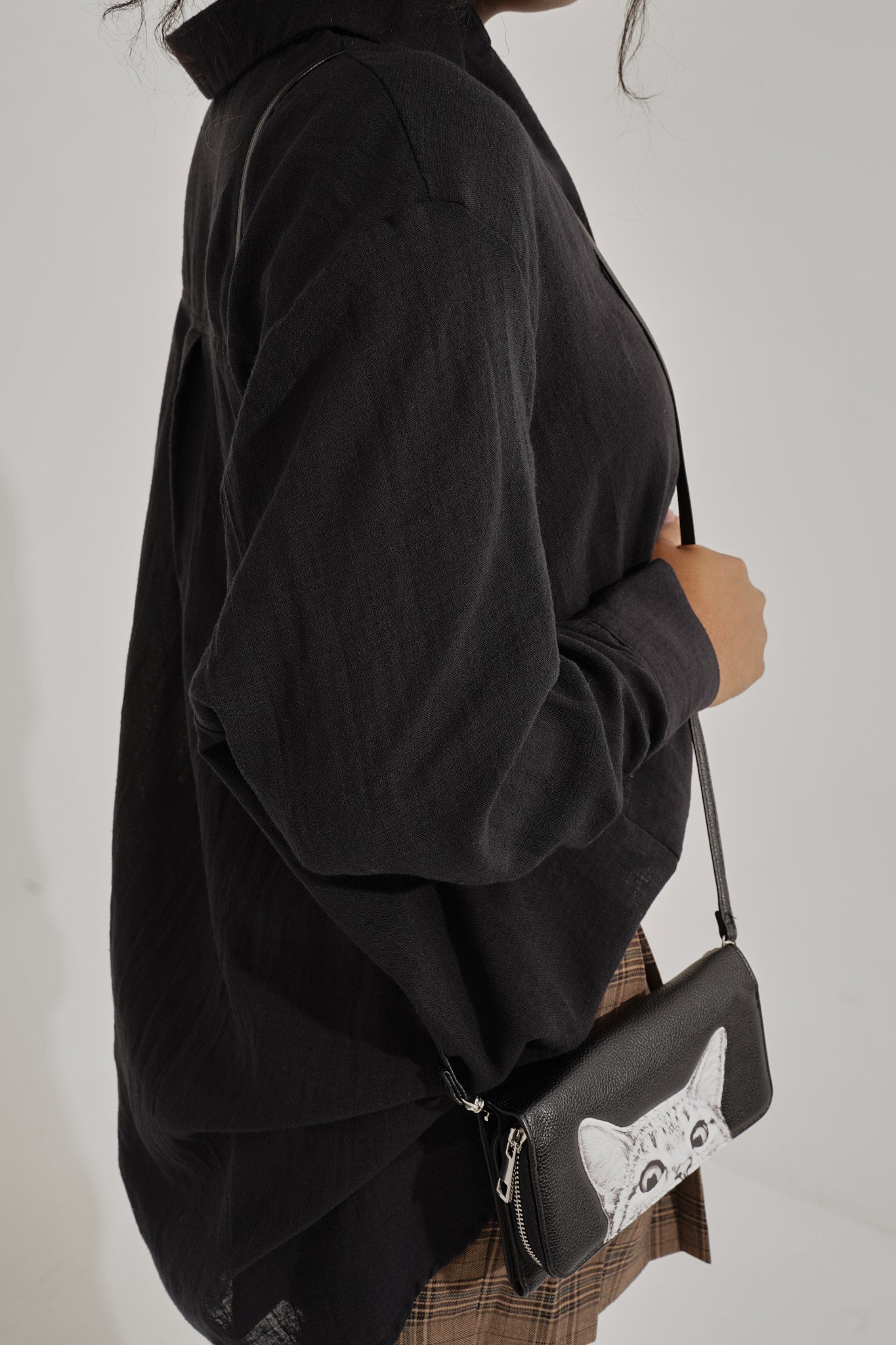 Cartera de vinilo con diseño de gato, que también puede usarse como clutch crossbody gracias a su correa desmontable. Incluye cierre magnético y cremallera, múltiples ranuras para tarjetas, billetes e identificación. Su tamaño compacto la hace ideal para salidas de día o de noche.