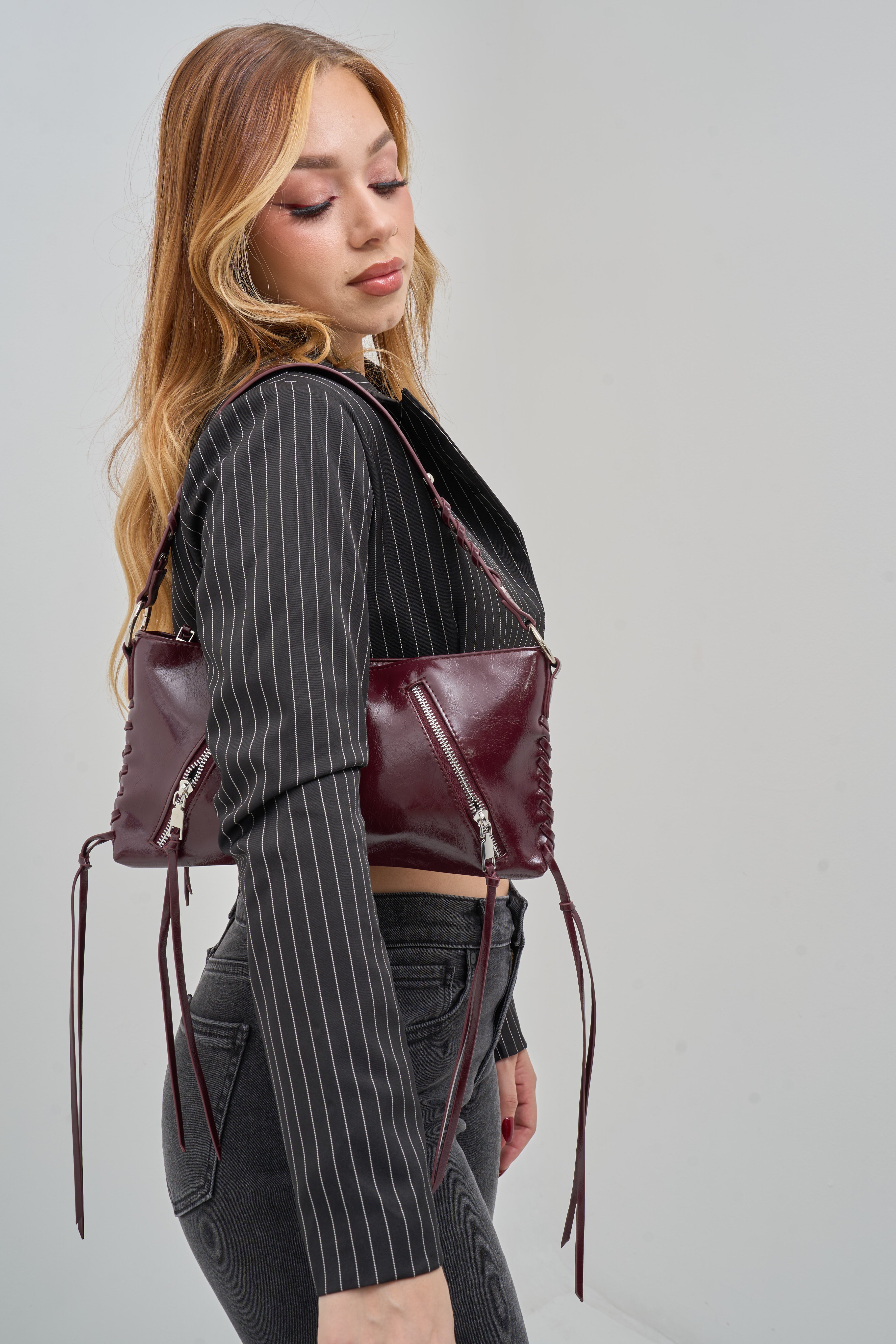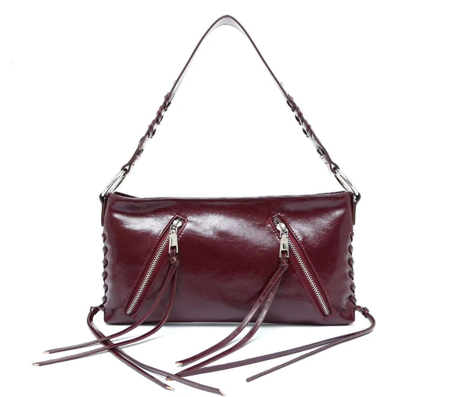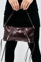 Bolso de hombro elegante y funcional, con cremalleras frontales que aportan estilo y practicidad. Su diseño incluye detalles de tiras y pasadores metálicos que le dan un toque moderno y sofisticado. Cuenta con un espacioso bolsillo interior para mantener tus objetos organizados y un cierre seguro con cremallera.