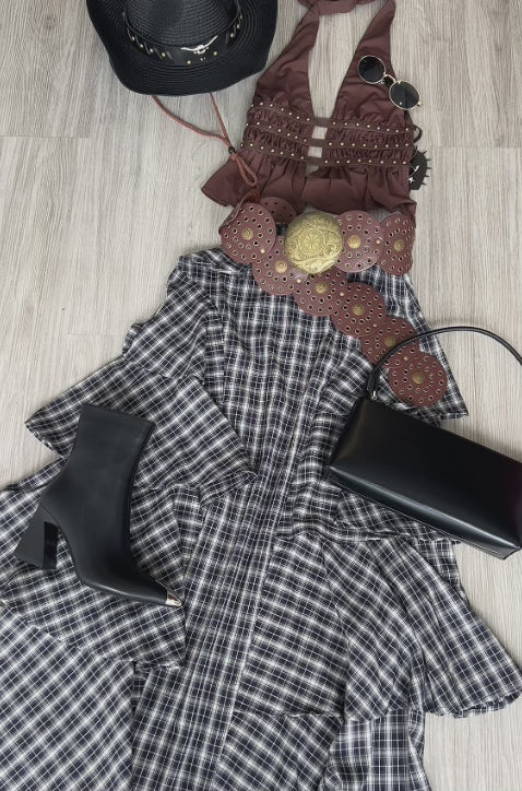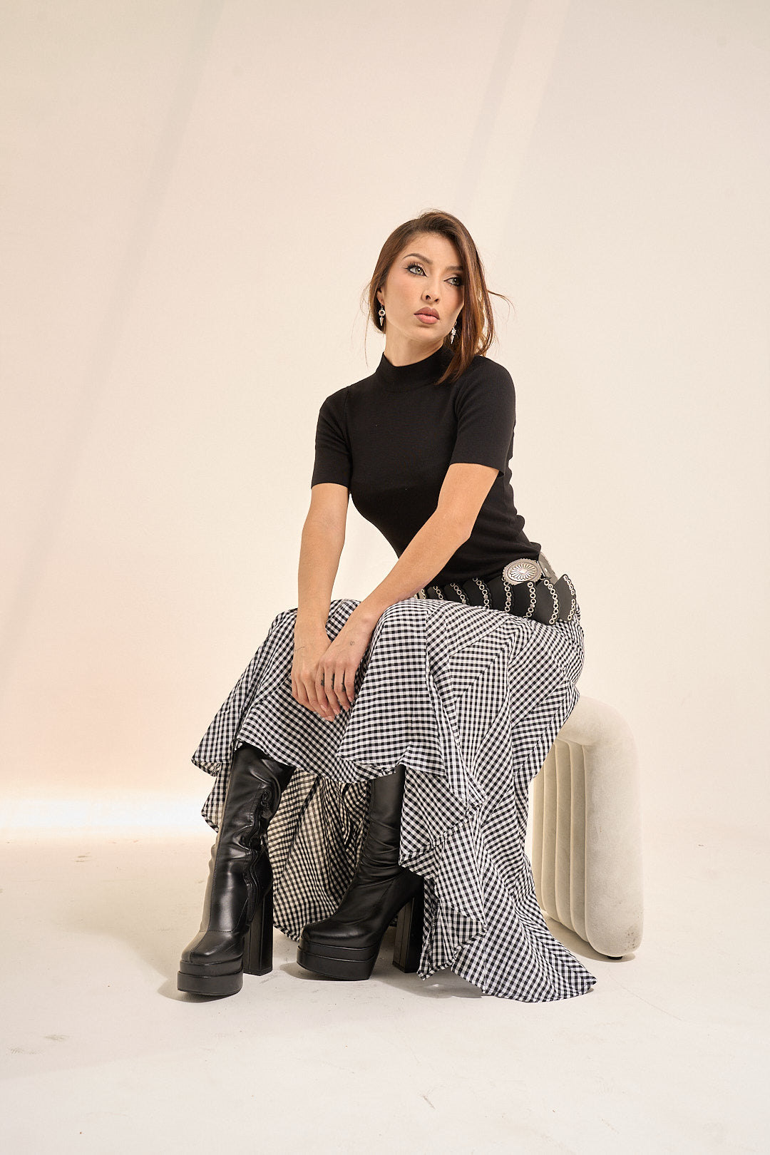 Falda con estampado de cuadros, pretina ajustada y dobladillo con vuelo. Su diseño femenino y fresco la hace perfecta para un look casual con un toque coqueto.