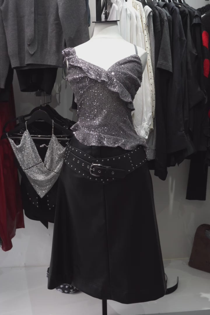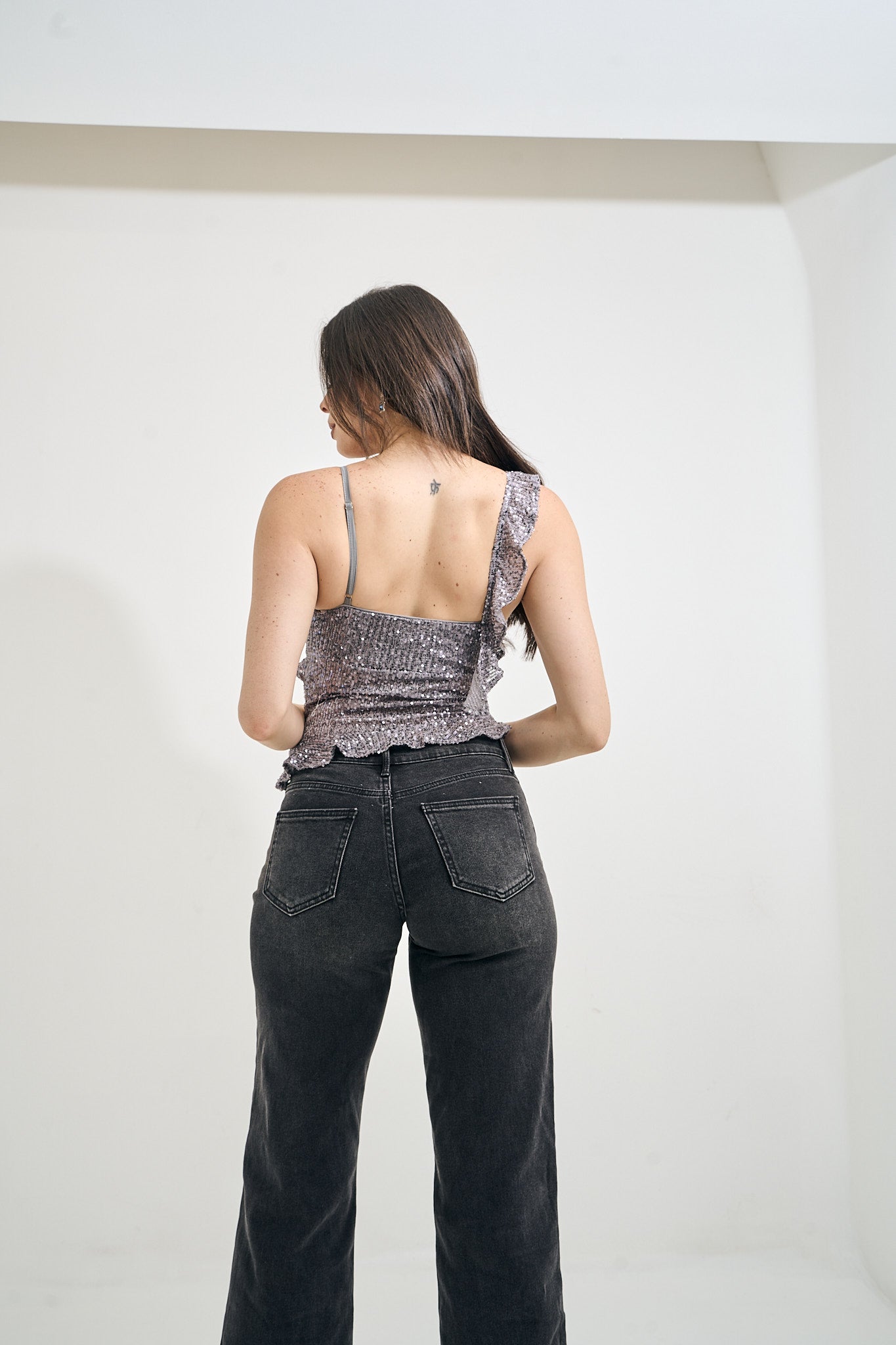 Top con apliques de lentejuelas y delicado detalle de volantes que aporta un toque femenino y elegante. Su diseño brillante lo convierte en la opción perfecta para ocasiones especiales o salidas nocturnas.