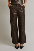 • Pantalones de talle alto confeccionados en piel sintética con acabado brillante. Su silueta estilizada aporta un aire contemporáneo y versátil, perfecto para combinar con tops ajustados o chaquetas estructuradas.