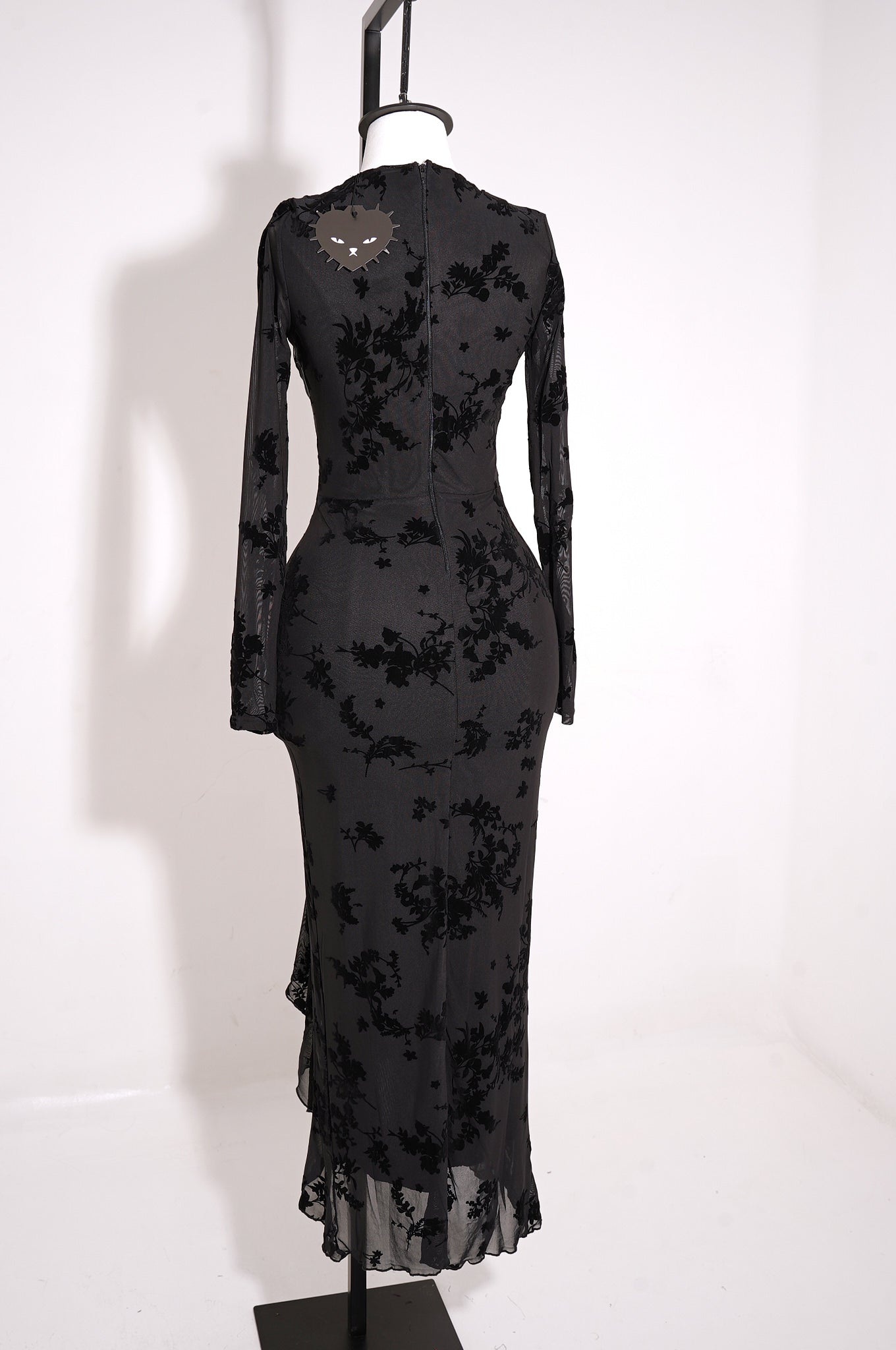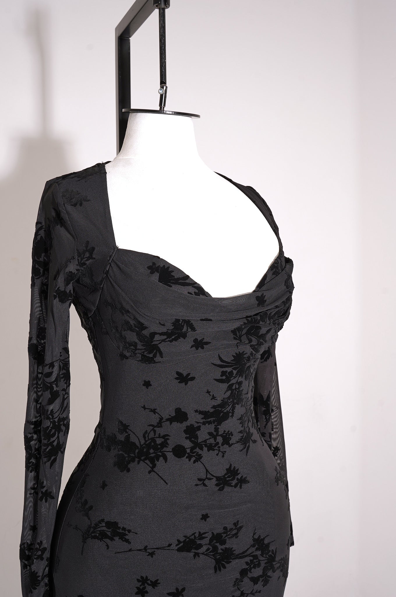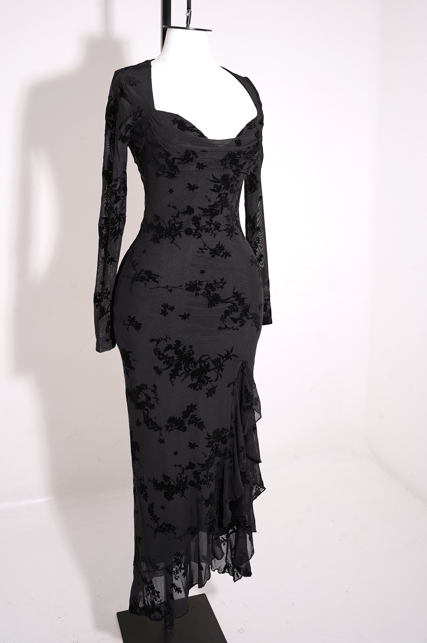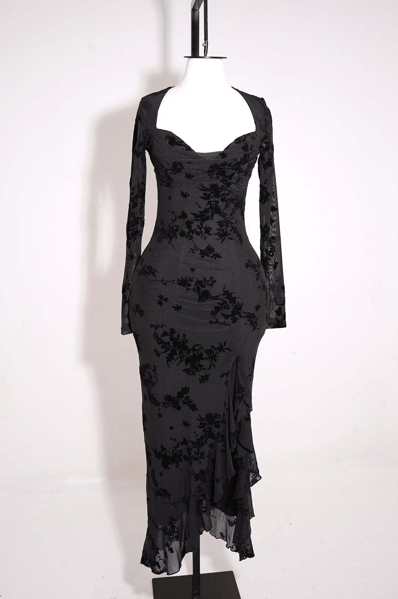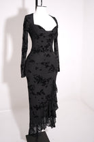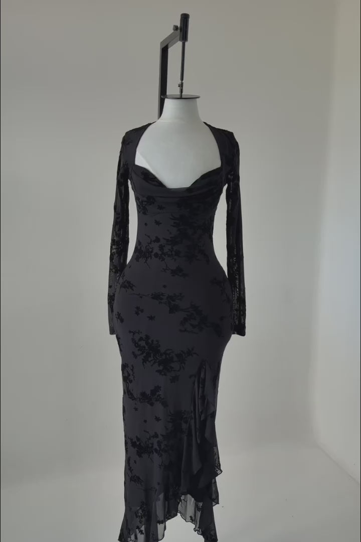 Este maxi dress floral de manga larga destaca por su diseño romántico y sofisticado. Confeccionado en mesh con flocking, presenta un escote sweetheart con busto plisado que realza la silueta, mientras que las mangas largas translúcidas aportan un toque etéreo y elegante. La abertura lateral con terminación de volantes añade movimiento y feminidad, complementada por copas integradas y forro completo para mayor comodidad. Una pieza ideal para eventos especiales, celebraciones formales o noches elegantes.