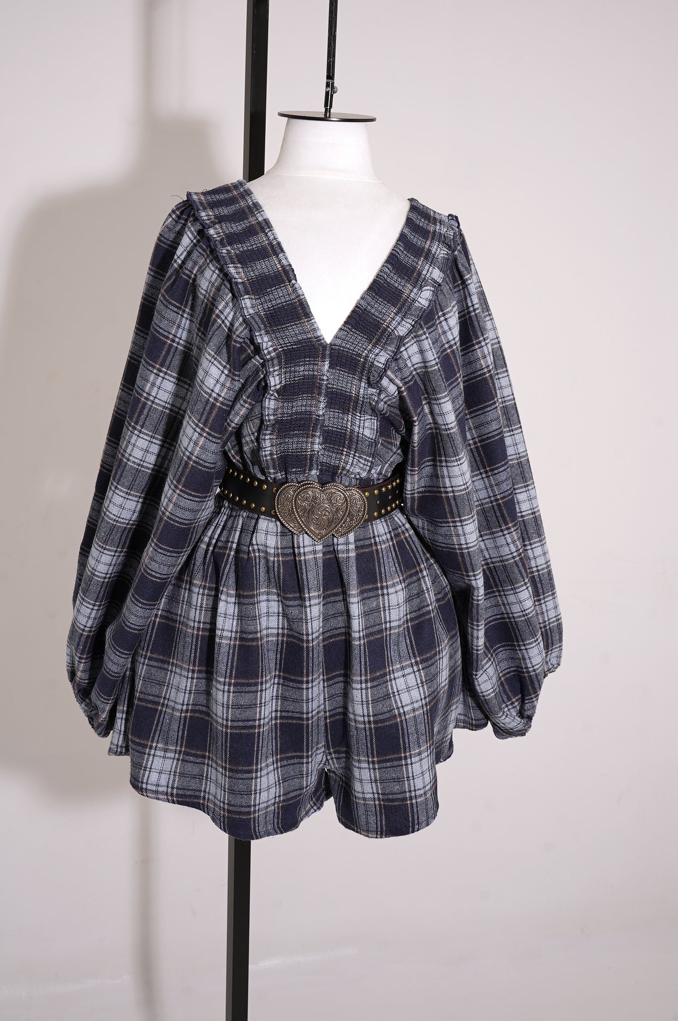 • Romper de estilo romántico con estampado plaid y una silueta cómoda que equilibra estilo y frescura. Presenta un escote en V con delicado detalle de olanes, mangas largas de caída relajada y cintura elástica que estiliza la figura sin sacrificar comodidad. Su diseño versátil lo convierte en una opción ideal para looks casuales con un toque femenino y acogedor.