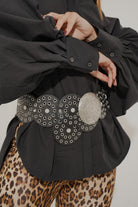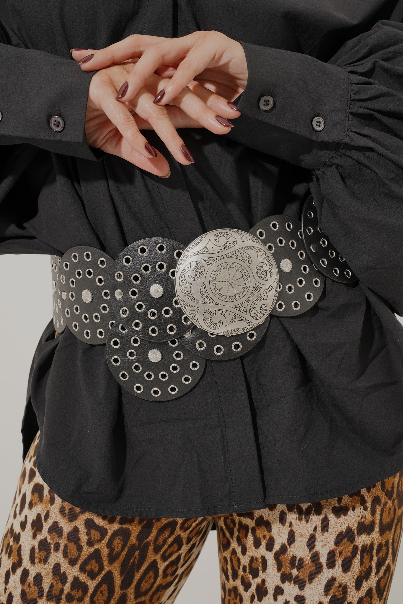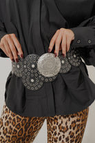 Cinturón ancho estilo western con acabado metálico, ideal para aportar un toque audaz y sofisticado a tus outfits. Su diseño ajustable lo hace perfecto para combinar con jeans, vestidos o faldas, resaltando la cintura y aportando un look moderno y llamativo.
