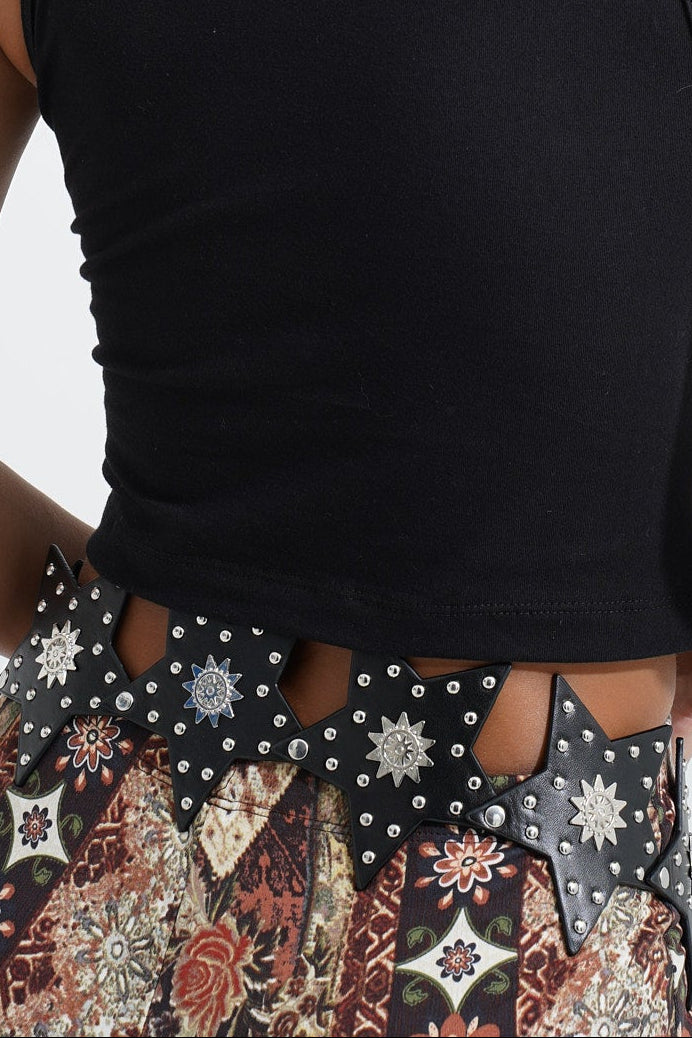 Cinturón tipo waist cincher elaborado en cuero sintético (PU) con apliques de estrellas metálicas. Su diseño ajustado realza la figura y aporta un toque punk y moderno al outfit. Ideal para combinar con vestidos, camisas o prendas oversize para crear un look con carácter.