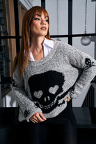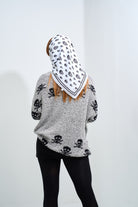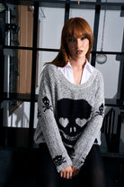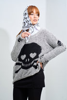 • Suéter de punto bicolor con estampado de calaveras, cuello redondo y detalles de rib en puños y borde inferior. Confeccionado en mezcla de algodón y acrílico, combina comodidad y estilo para un look casual o alternativo.