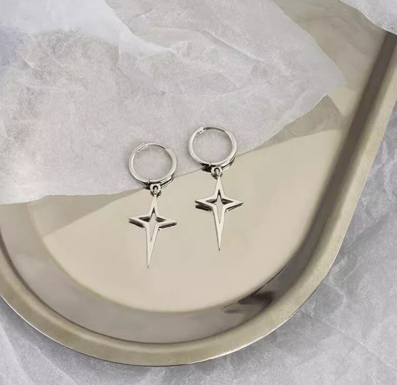 • Aretes tipo argolla con un diseño de estrella de cuatro puntas que combina estilo punk con un toque moderno y elegante. Fabricados en acero inoxidable quirúrgico, son resistentes, duraderos y perfectos para el uso diario. Su forma distintiva y acabado brillante los convierte en el accesorio ideal para destacar cualquier look, ya sea casual o más alternativo.