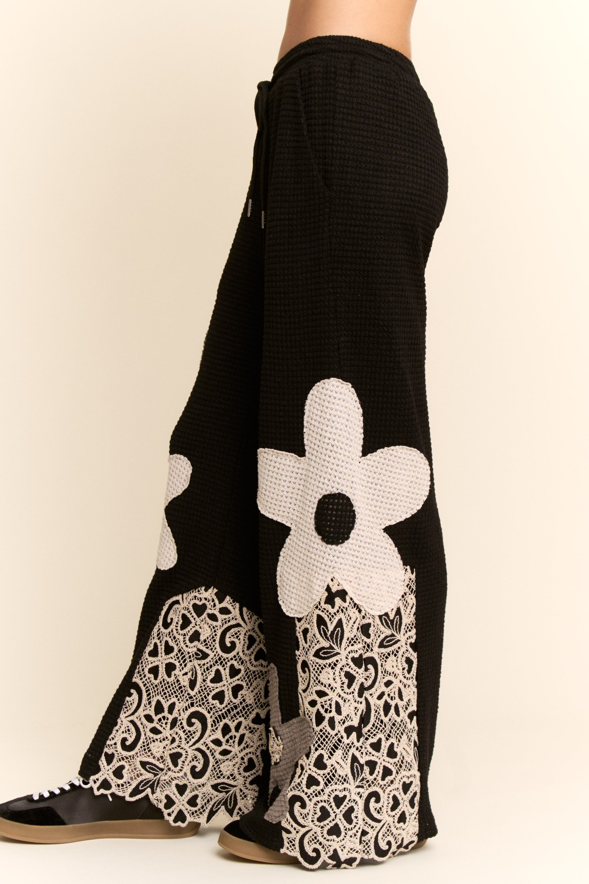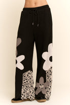 Pantalón de punto térmico con pierna amplia, detalles de parches florales al frente y contraste de encaje a los lados para un toque femenino. Cómodo y relajado, perfecto para un look casual con estilo.