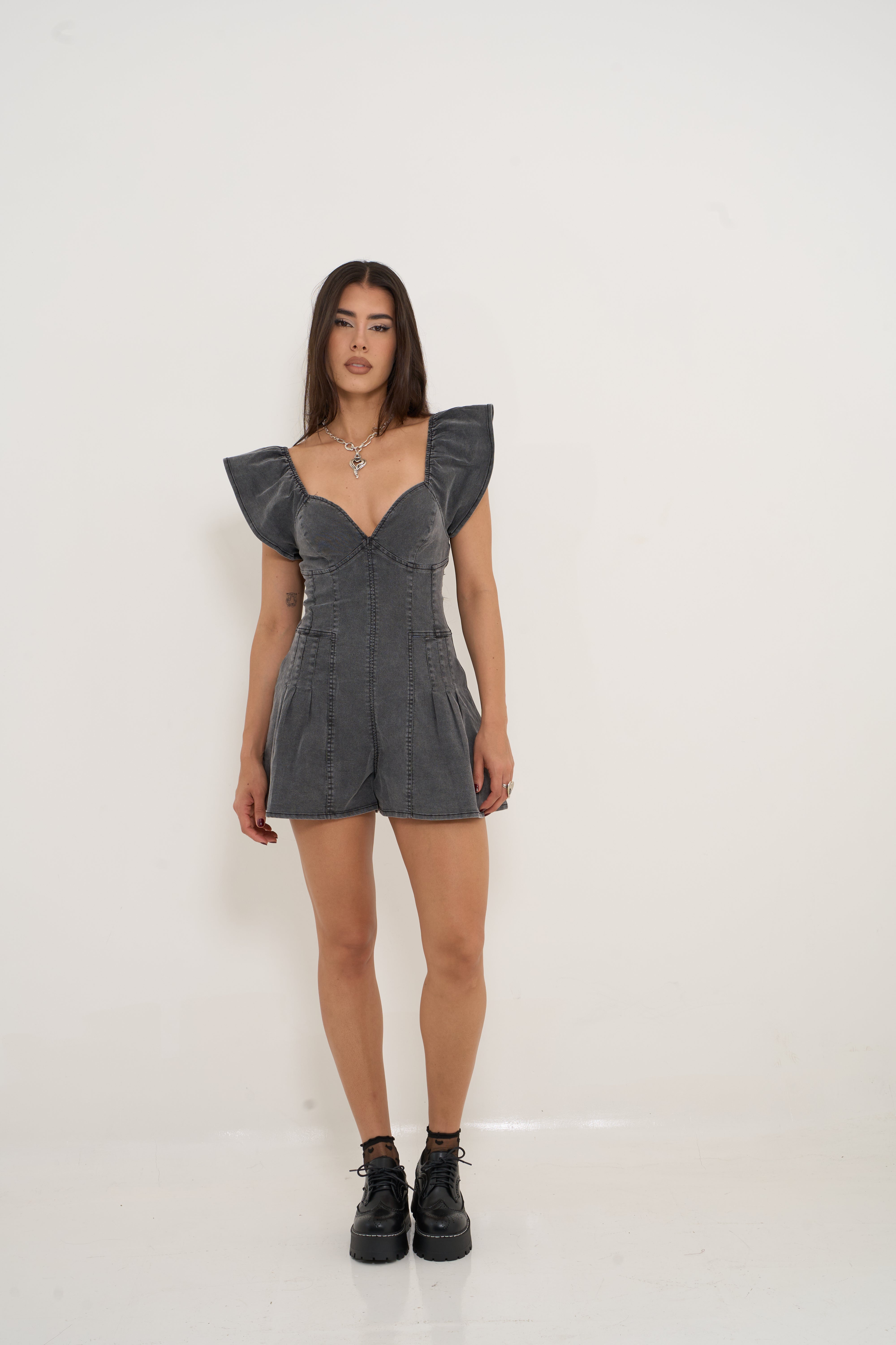 - Jumper elástico con escote corazón, mangas con volantes, pliegues en la cadera y lazo en la espalda.