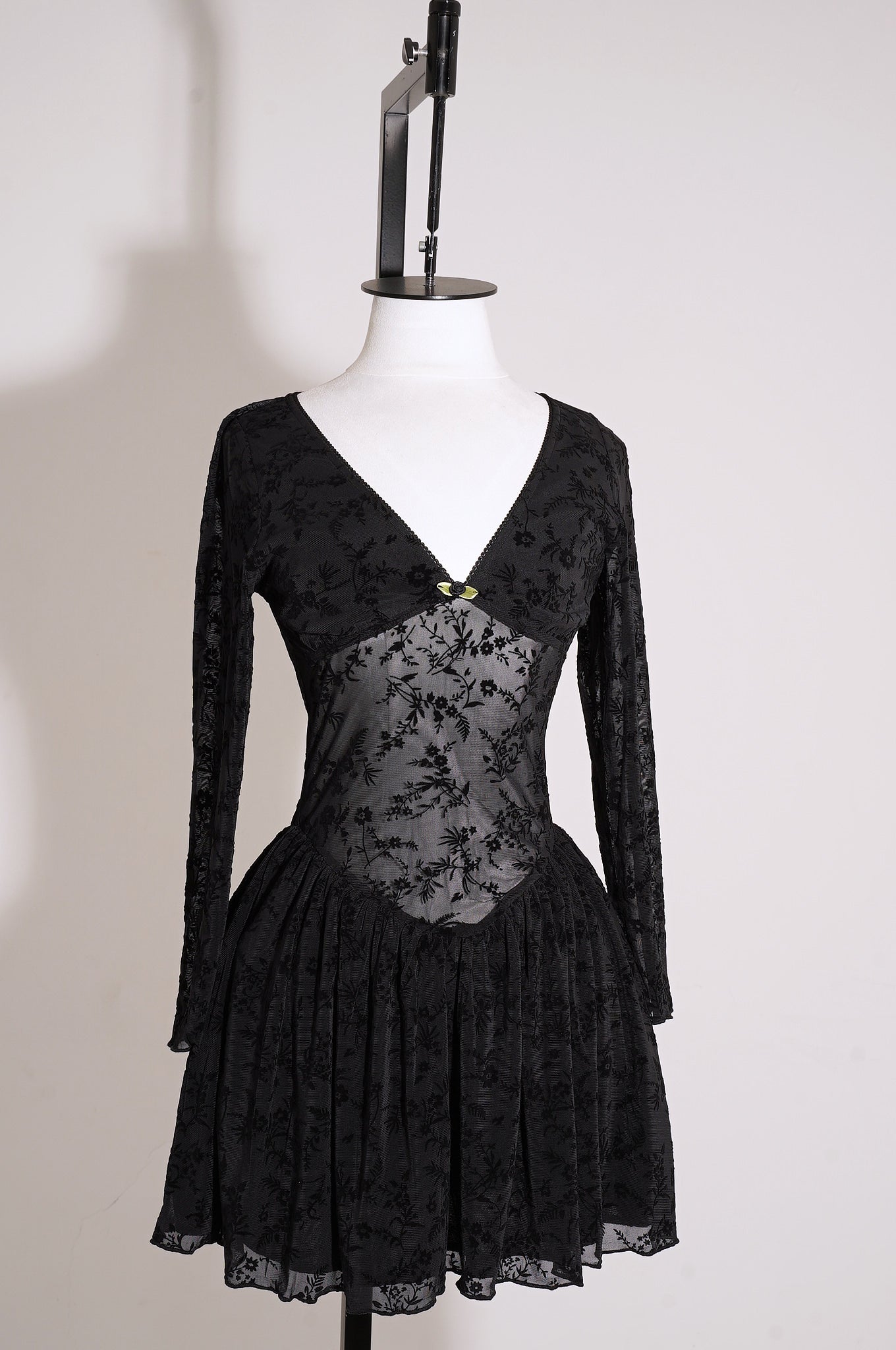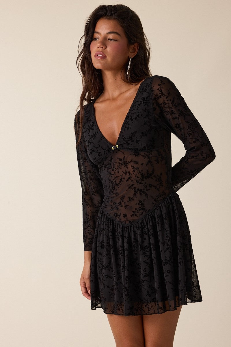 • Este vestido mini combina una capa translúcida con un delicado burnout floral que aporta textura y elegancia. Presenta un favorecedor escote en V, mangas largas y un corte fit & flare que define la cintura y aporta movimiento. Su diseño semitransparente ofrece un toque sensual sin perder la sofisticación, mientras que el forro interior asegura comodidad durante todo el día. Una pieza perfecta para eventos de noche, salidas especiales o looks románticos y modernos.