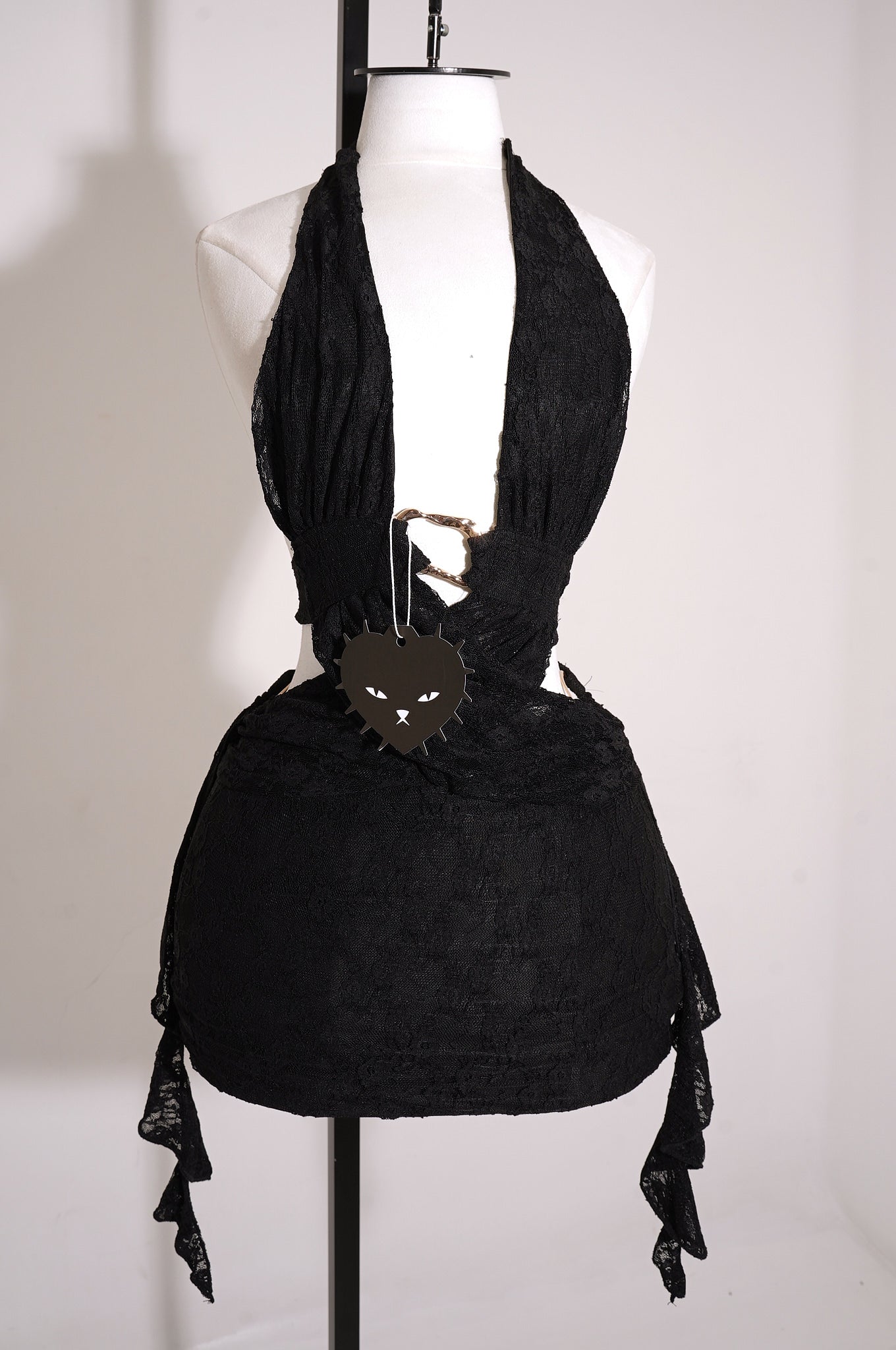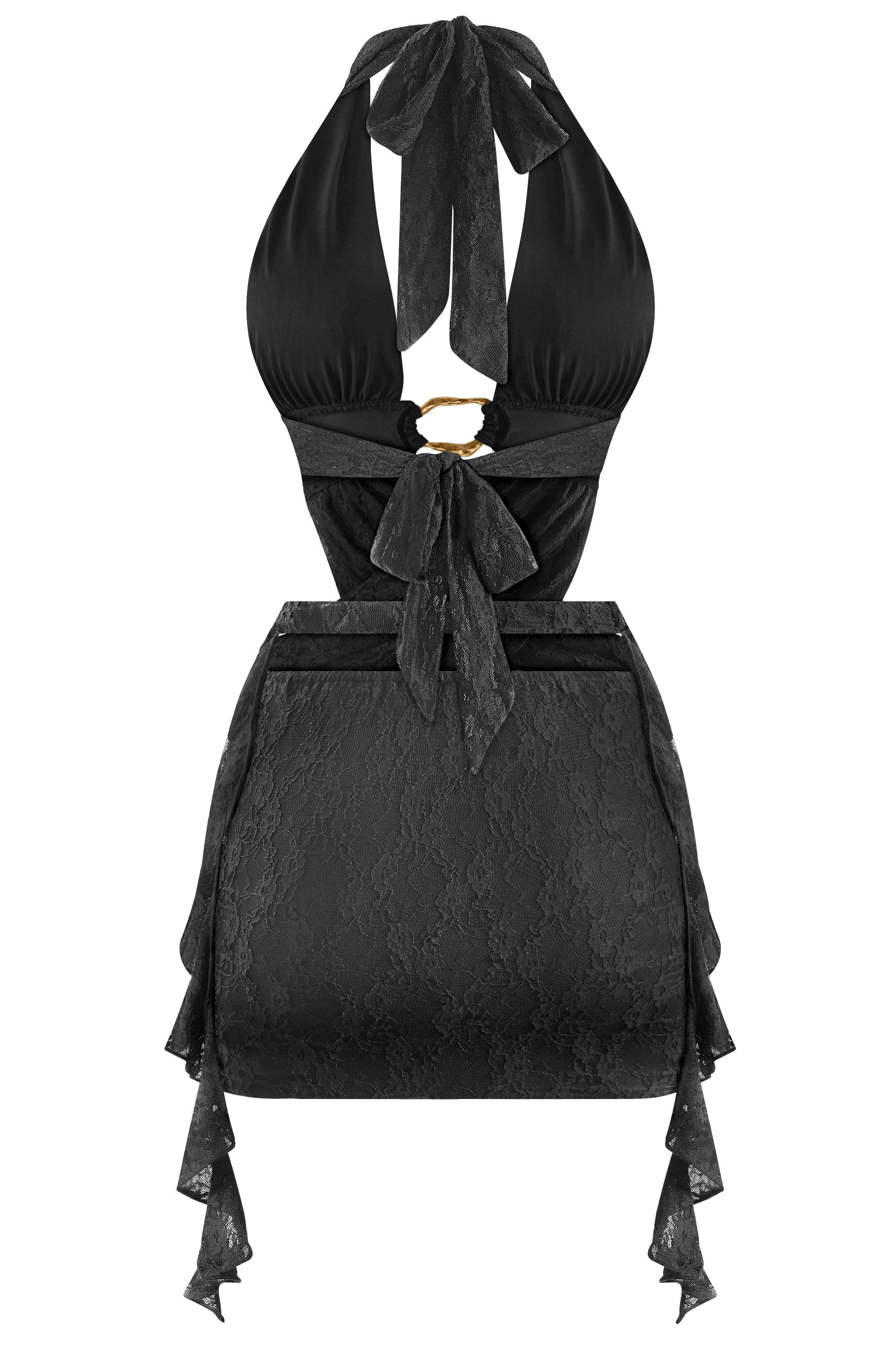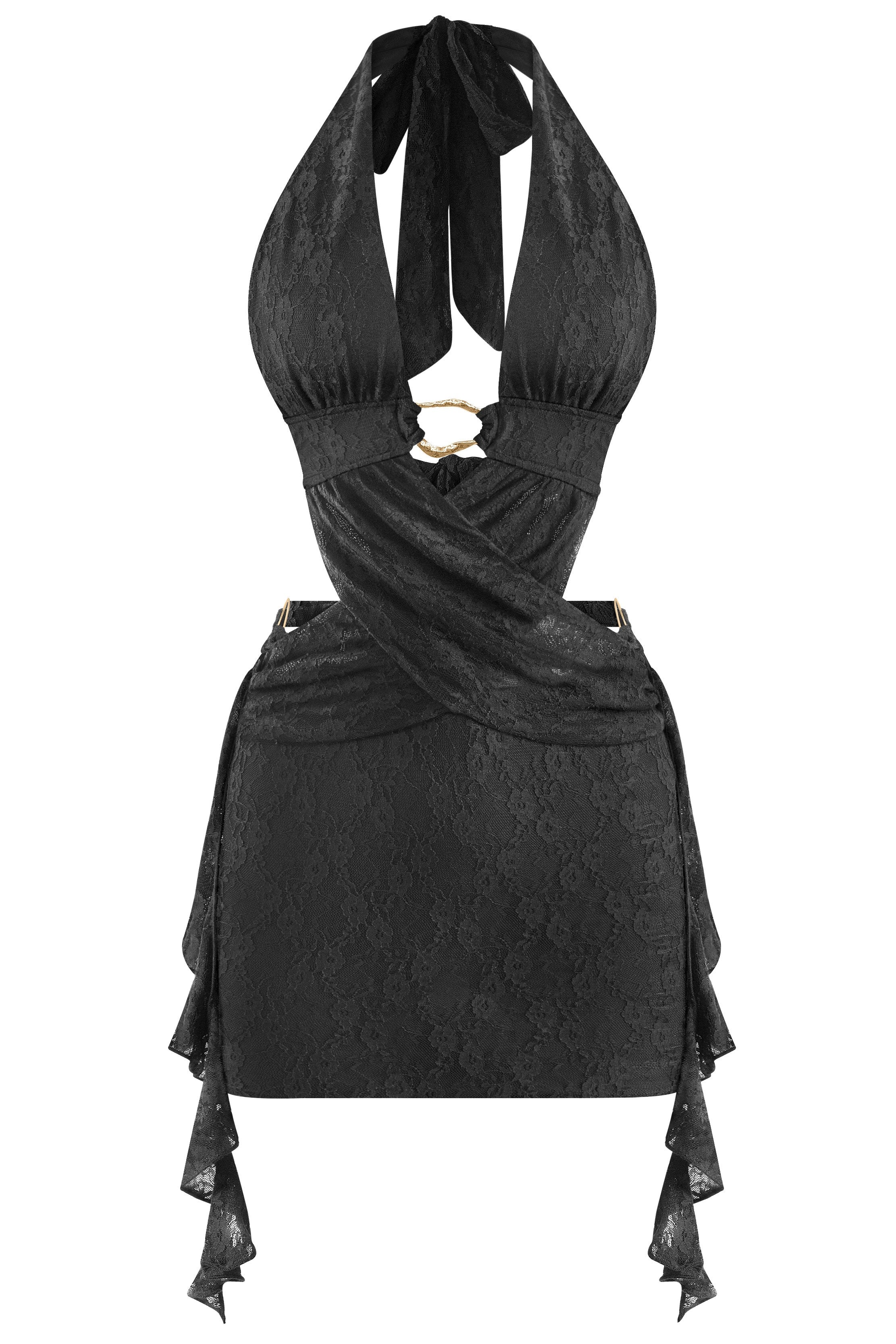 • Mini vestido halter confeccionado en encaje delicado con un diseño sensual y elegante. Presenta un aro metálico plateado al frente con detalles cutout, espalda abierta con amarre ajustable y volantes laterales en cascada que aportan movimiento y un acabado femenino. El torso semitransparente y el forro parcial crean un balance perfecto entre sofisticación y sensualidad. Ideal para noches especiales, fiestas o eventos donde quieras destacar.