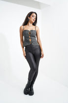 - Leggings lisos Tejido elástico de piel sintética con efecto mojado.