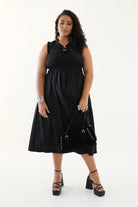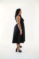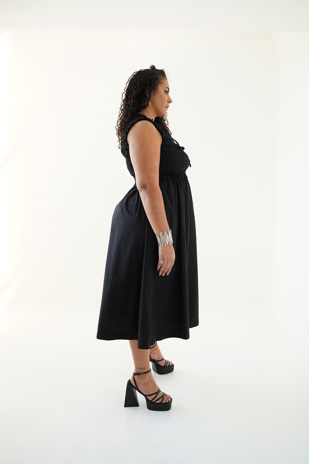Vestido midi con escote en V, detalle de fruncido en el cuerpo y lazo al frente. Incluye bolsillos laterales para mayor practicidad y un ajuste cómodo que resalta la silueta.