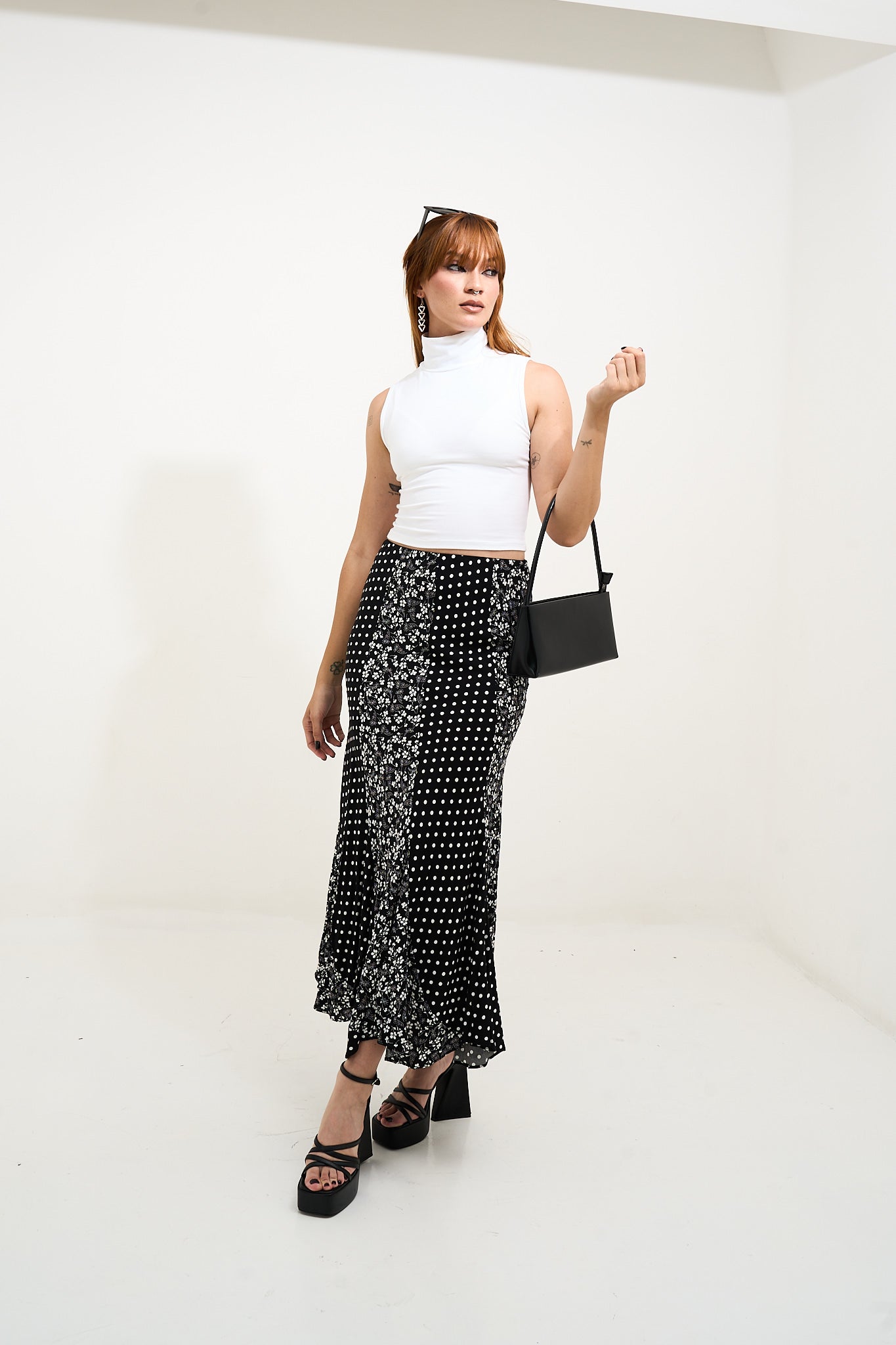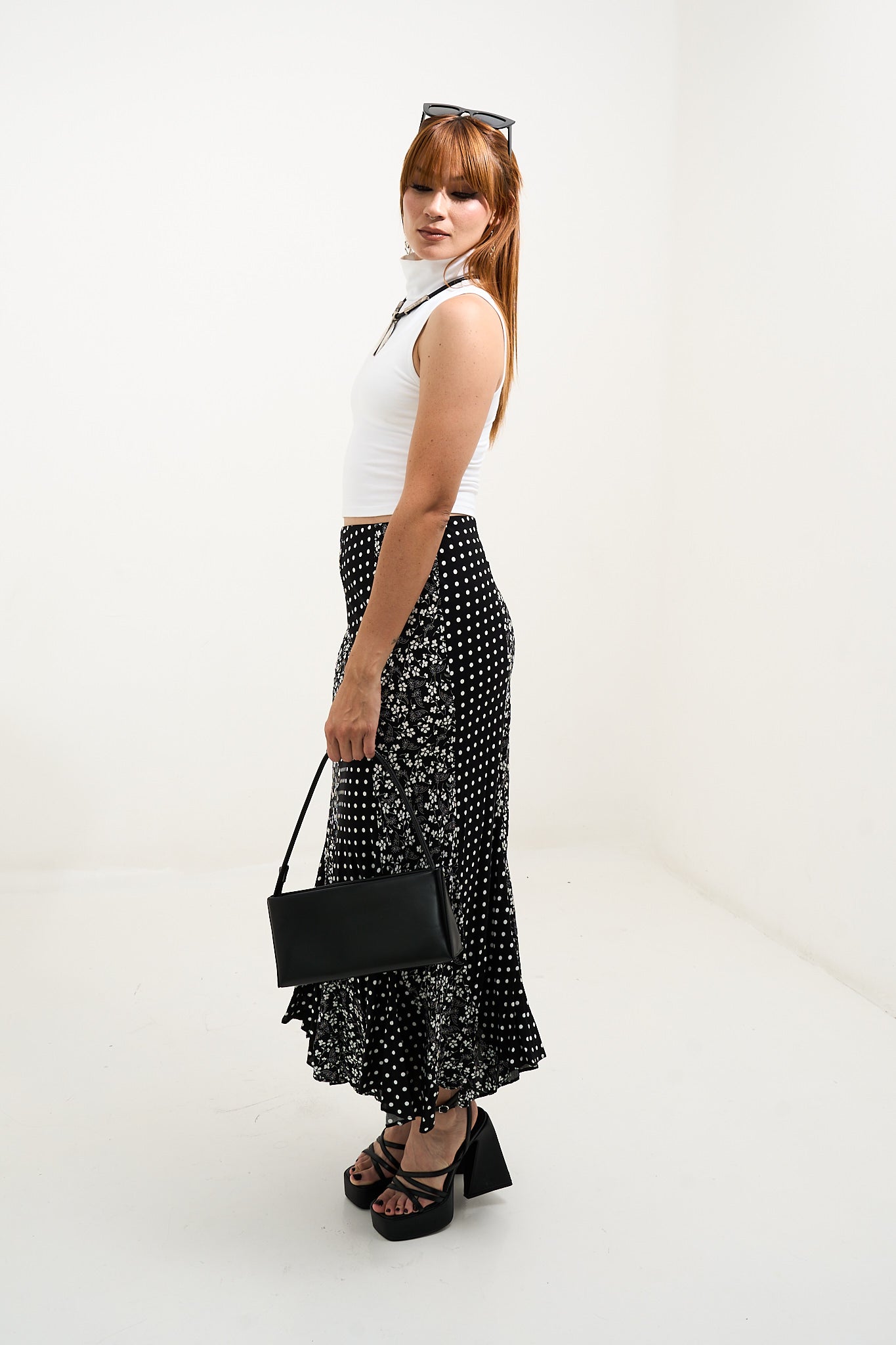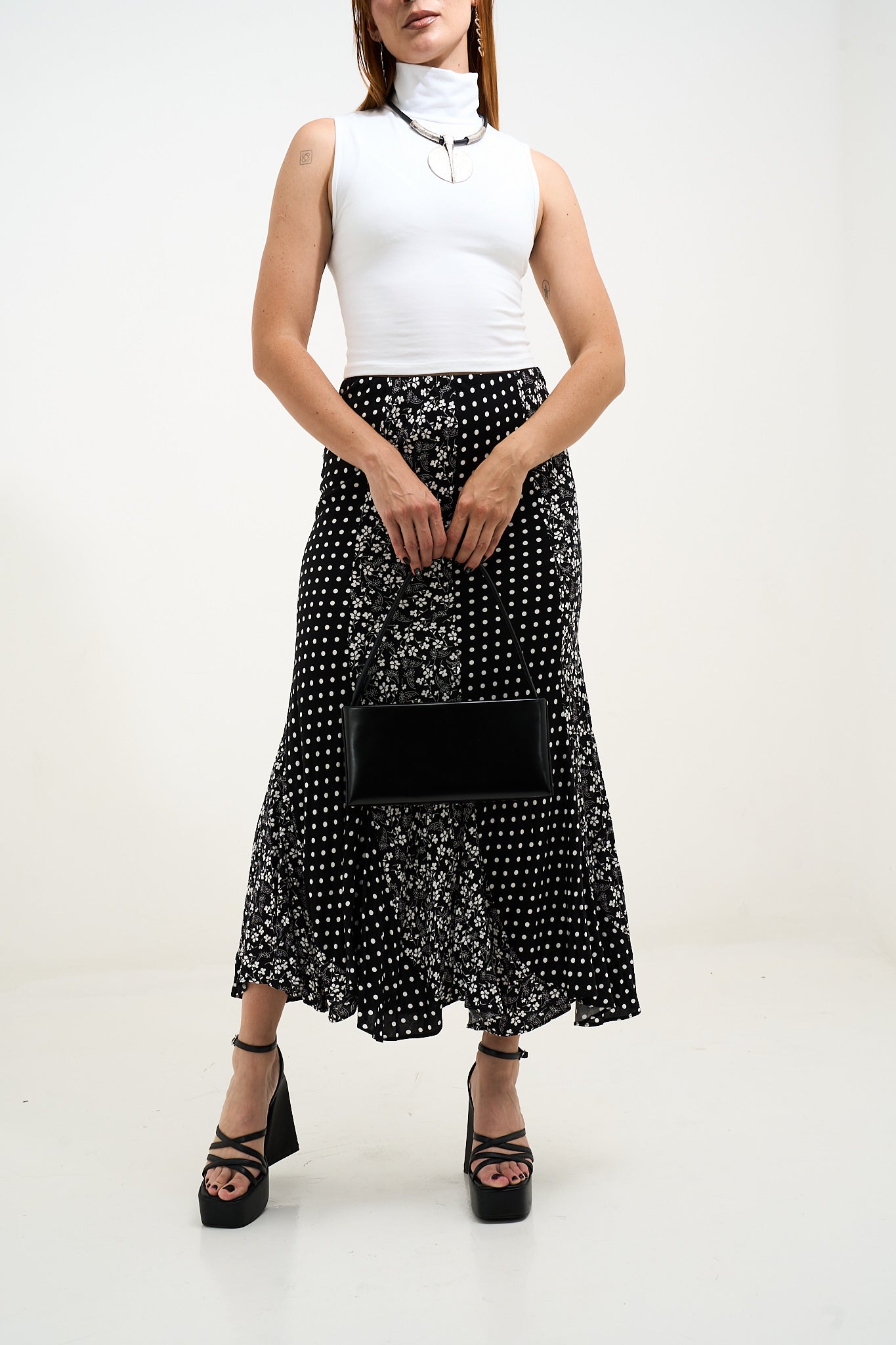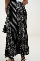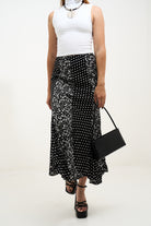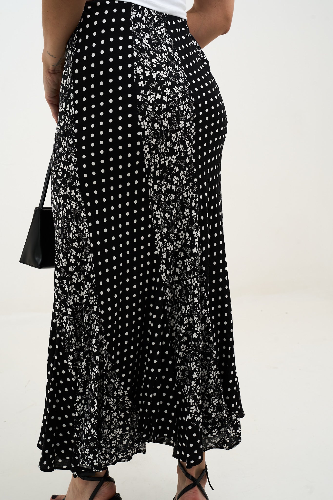 • Maxi skirt de silueta fluida que combina el encanto vintage con un diseño de estampado mixto. La mezcla de delicadas flores y clásicos lunares crea un look llamativo y femenino, mientras su tela ligera se mueve con suavidad en cada paso. Perfecta para combinar con un tank o una blusa para un estilo fresco y elegante sin esfuerzo.