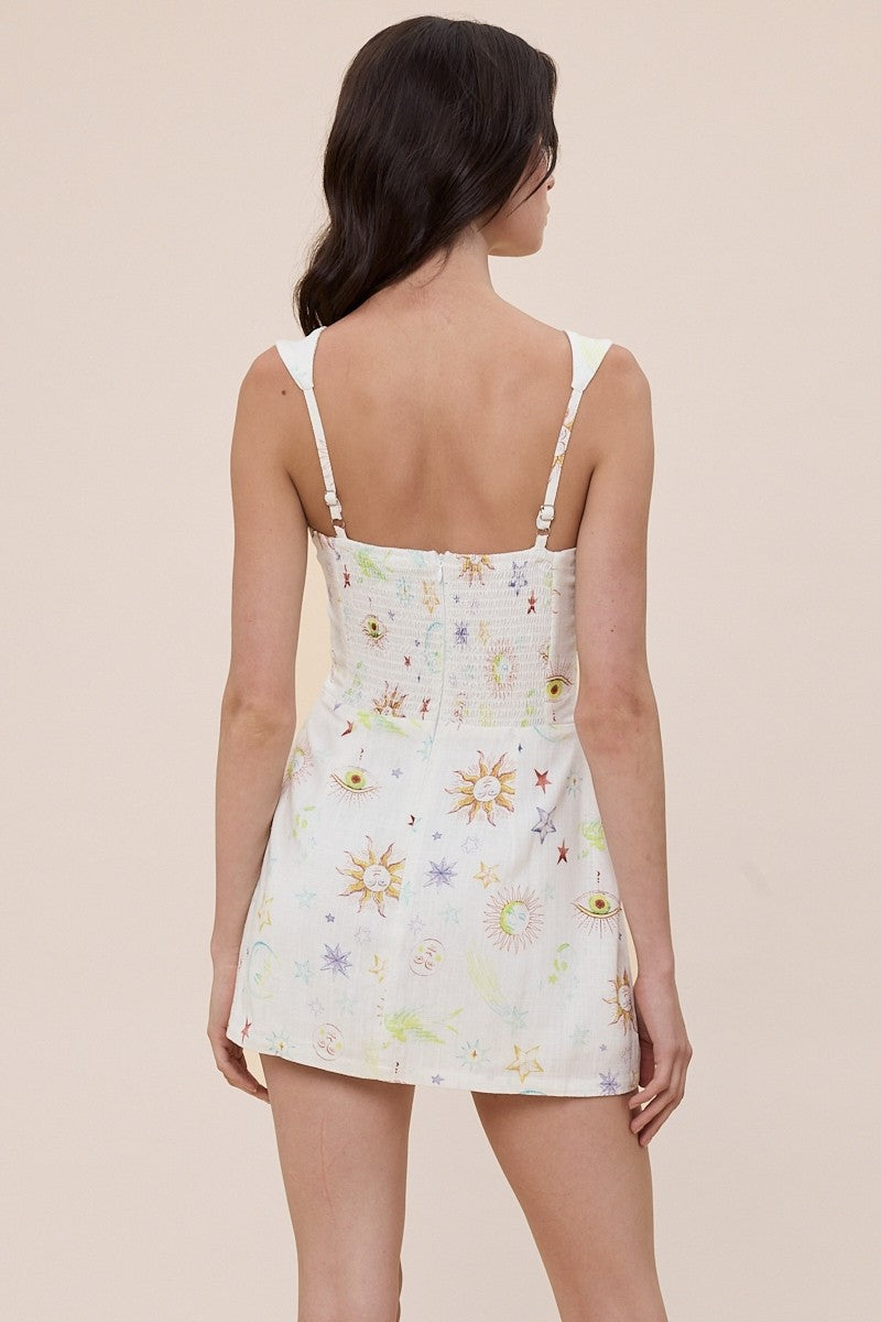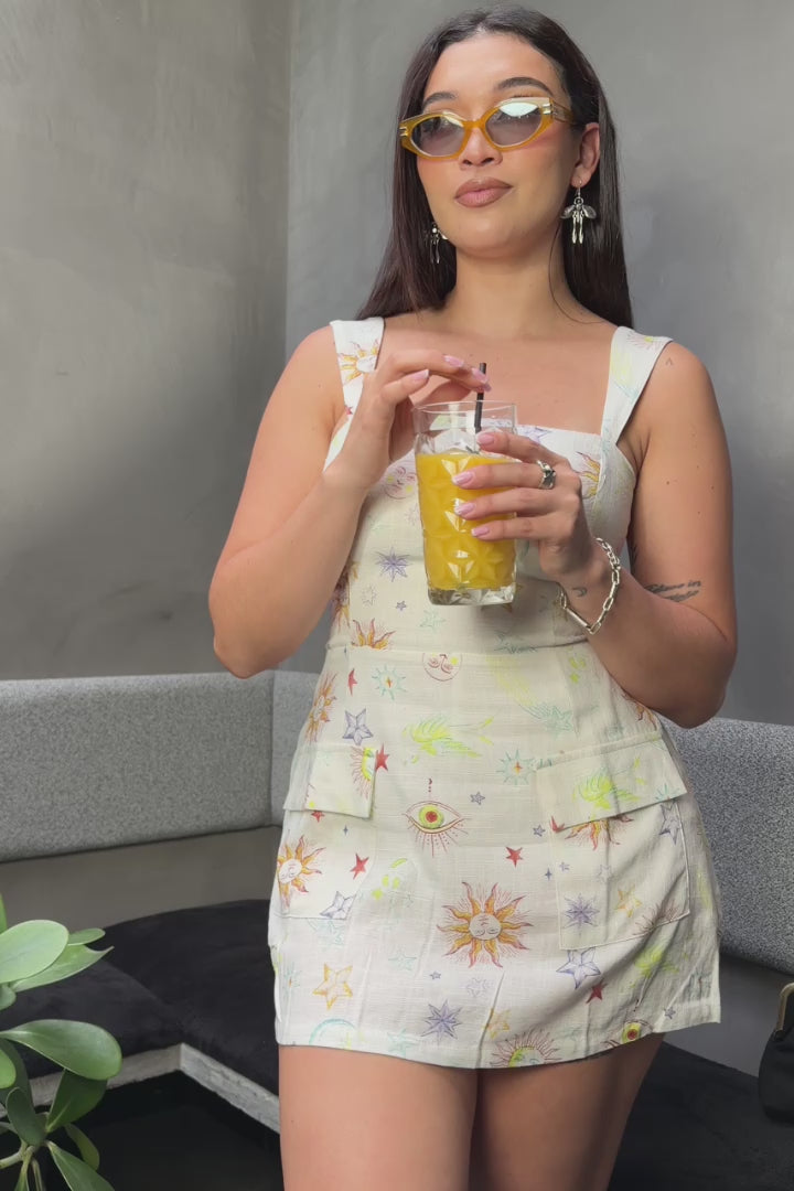 Mini dress de lino con escote cuadrado y diseño Galaxy Print que aporta un toque único y fresco. Su silueta sin mangas, espalda smocked y cierre trasero con zipper brindan ajuste cómodo y favorecedor, mientras que los bolsillos frontales y los shorts internos añaden practicidad y seguridad. Una pieza ligera y versátil, perfecta para un look casual con personalidad.