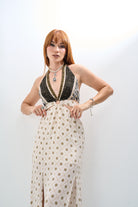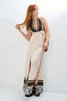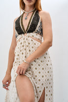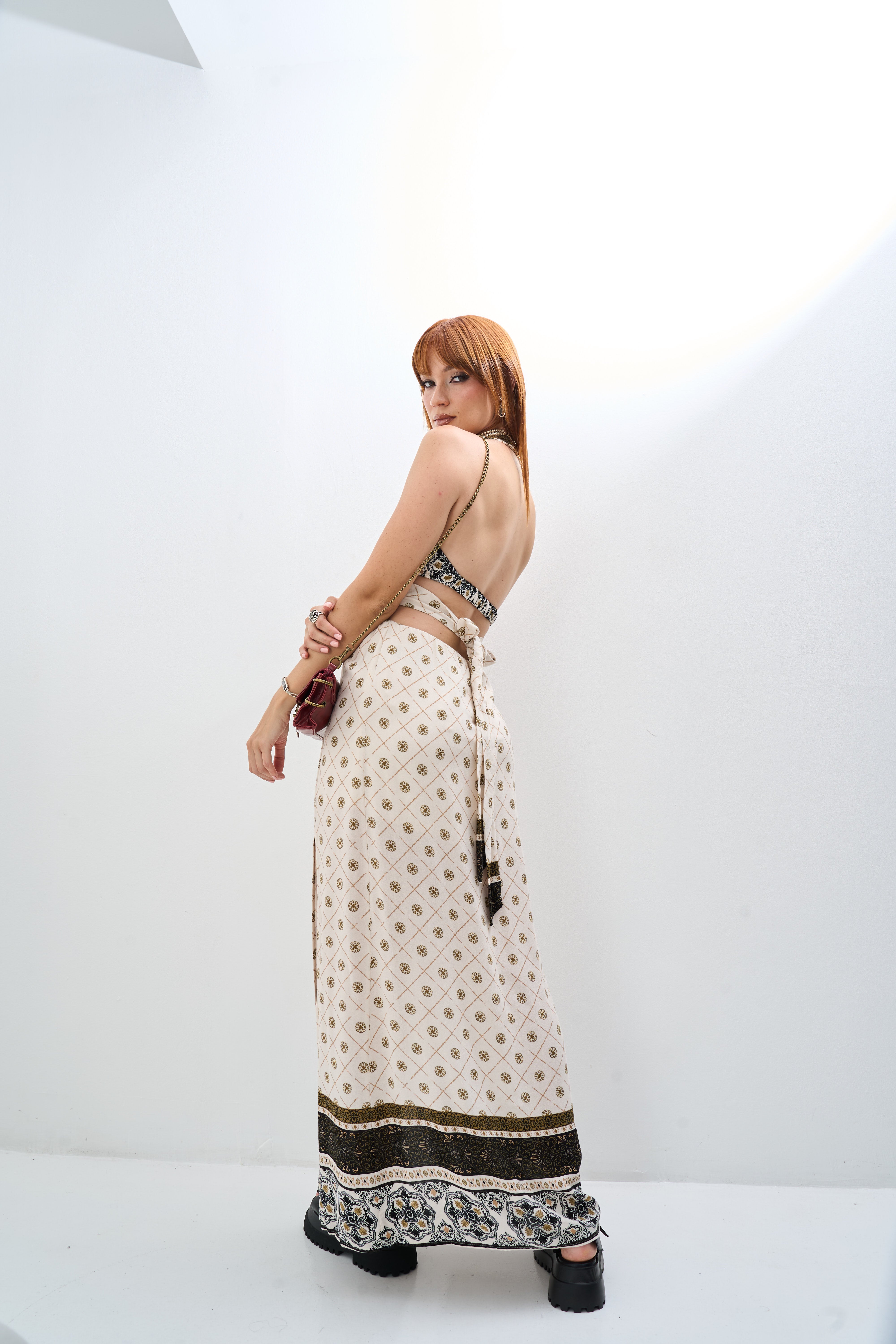 Vestido maxi con estampado y detalles de corte en el torso, ideal para un look veraniego y moderno. Cuenta con hebillas O-ring en la cintura, cierre elástico y lazo envolvente en la parte posterior, abertura frontal y diseño sin mangas.