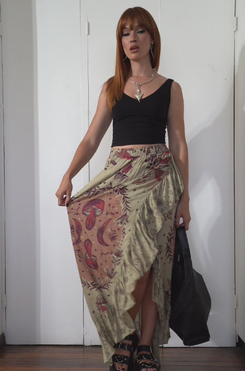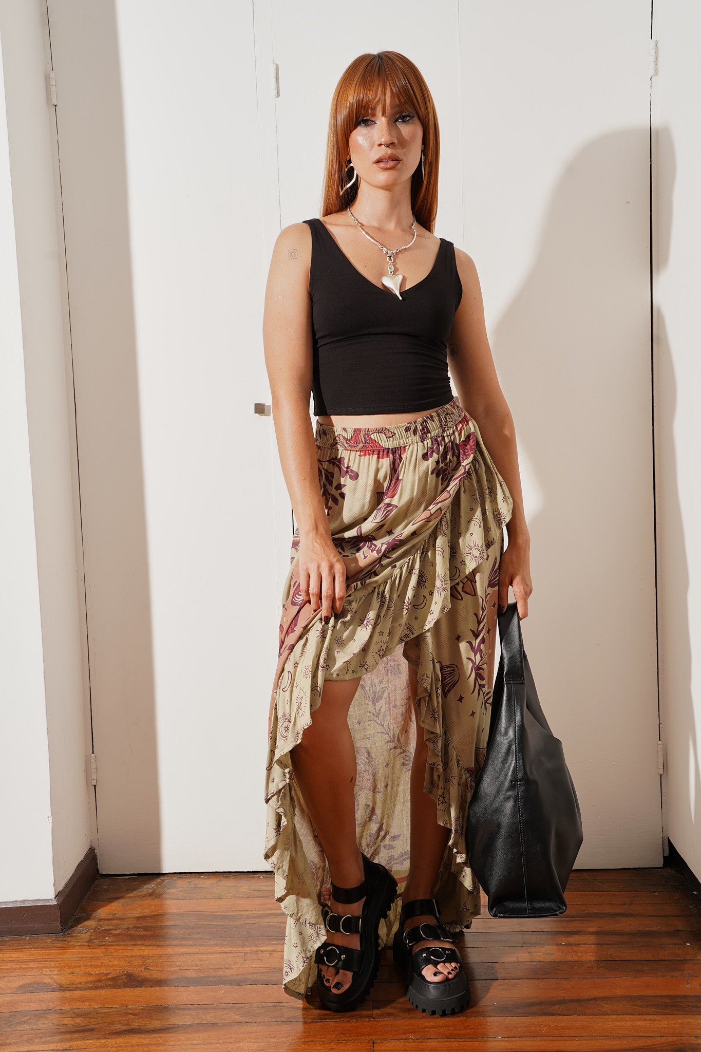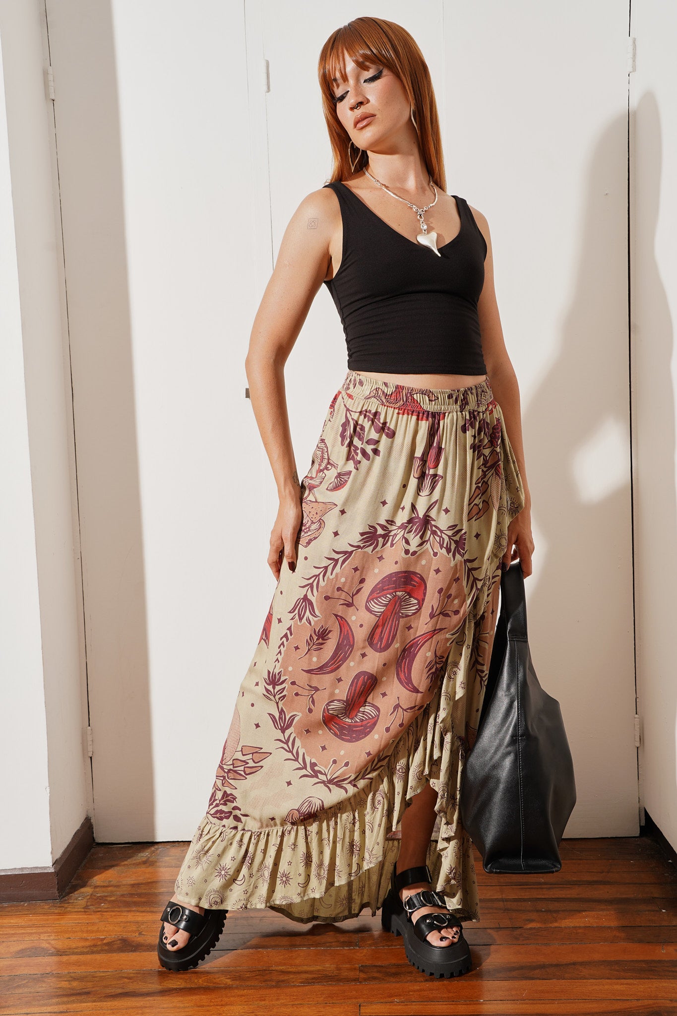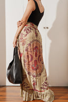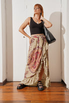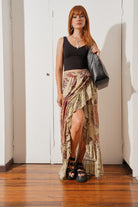 Maxi falda envolvente confeccionada en viscosa ligera con estampado tipo pañuelo en tonos vintage. Su cintura elástica y detalles de volantes en cascada crean un ajuste cómodo y un movimiento fluido, ideal para un look boho moderno y versátil.
