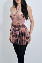 Mini vestido con estampado en malla, diseñado con un halter ajustable que incorpora un detalle de aro metálico al frente. Cuenta con copas incluidas para mejor soporte y paneles laterales fruncidos que estilizan la silueta. Su falda de triple capa con volantes añade movimiento, mientras que el short interior ofrece mayor comodidad. Un estilo femenino, favorecedor y perfecto para destacar.