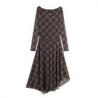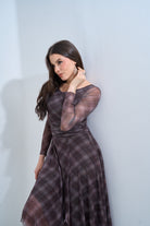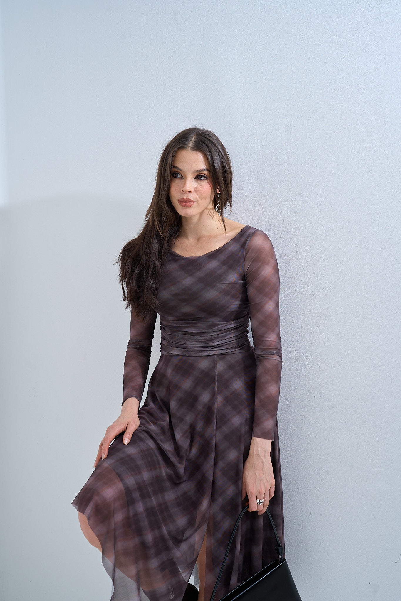 Vestido midi con un diseño de cuadros y textura de malla sedosa. Presenta un corte fluido y femenino que combina elegancia y ligereza, ideal para ocasiones casuales o eventos semiformales. Su caída suave y el tejido translúcido le dan un aire sofisticado con un toque moderno.