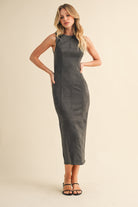 Vestido midi sin mangas en acabado gamuza con abertura trasera. Diseño ajustado con un estilo moderno y versátil para distintas ocasiones.