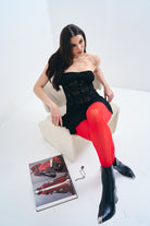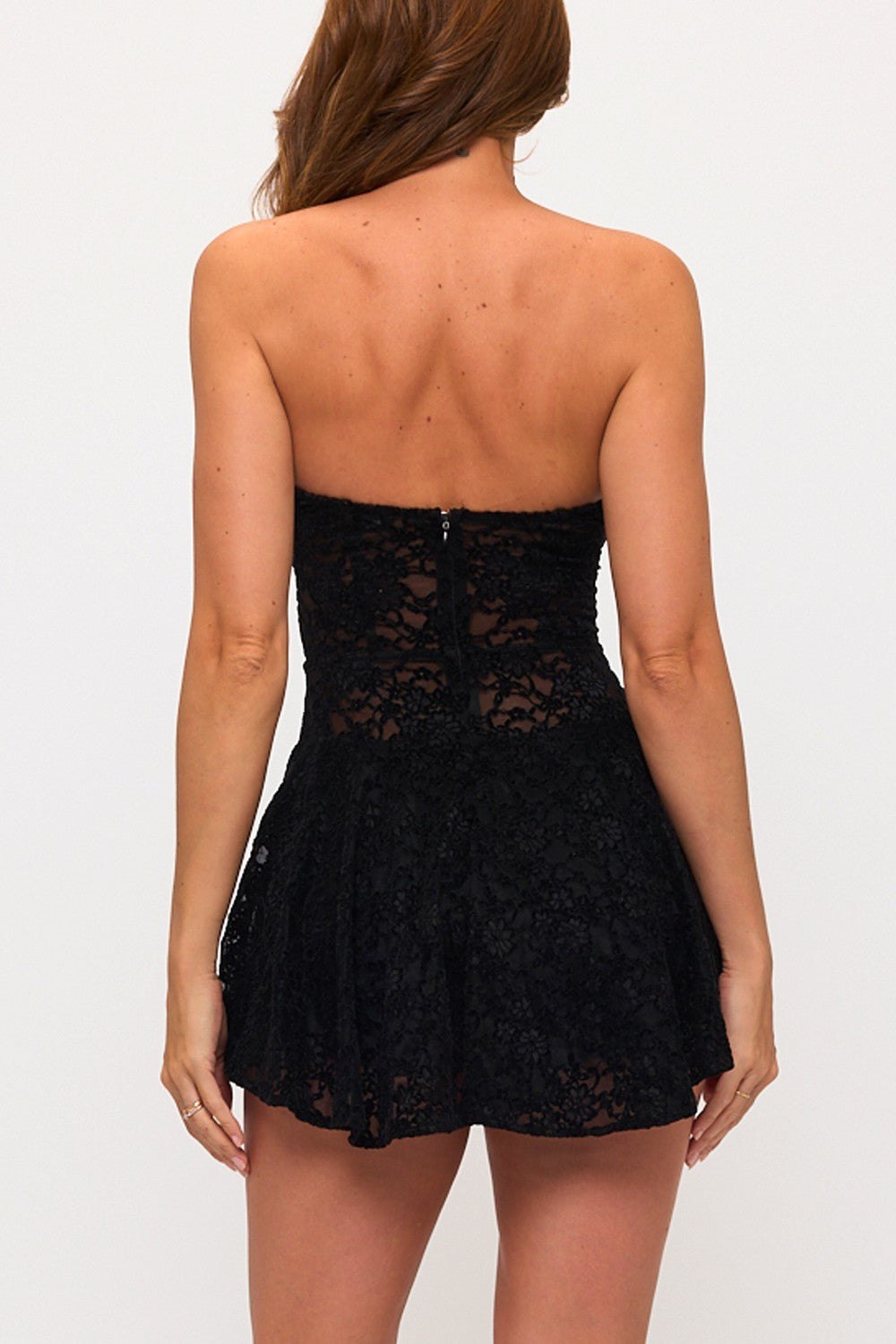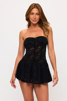 Mini vestido fit & flare con corpiño estilo corset semitransparente y varillas para una silueta definida. Presenta un escote corazón, detalle floral en el centro, falda con volantes y cierre posterior. El tejido de encaje y terciopelo aporta un toque romántico y elegante. Incluye shorts interiores para mayor comodidad.