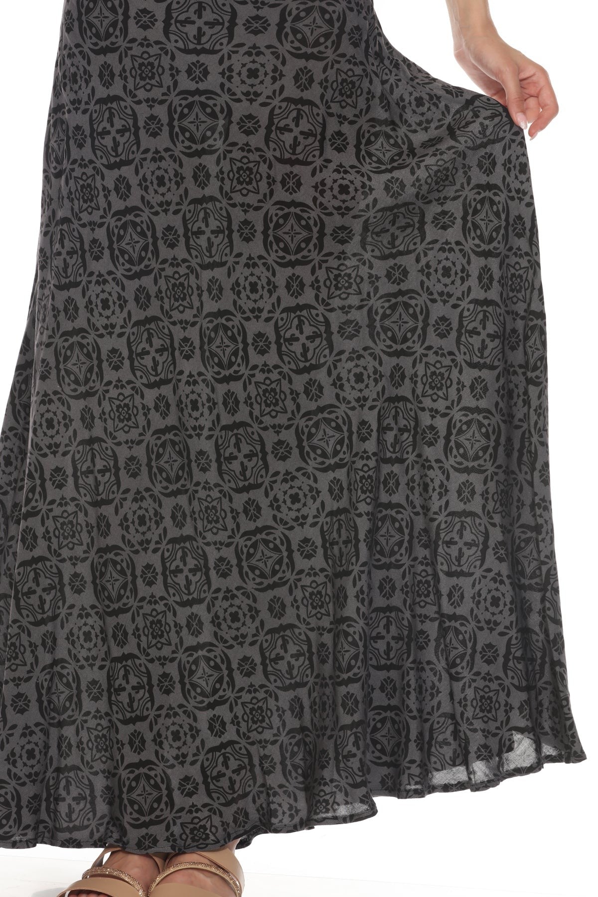 Falda larga con un elegante estampado de azulejos inspirado en el arte marroquí. Su corte al bies ofrece una caída fluida y favorecedora que se mueve con naturalidad al caminar. Perfecta para crear looks bohemios o sofisticados según la ocasión.