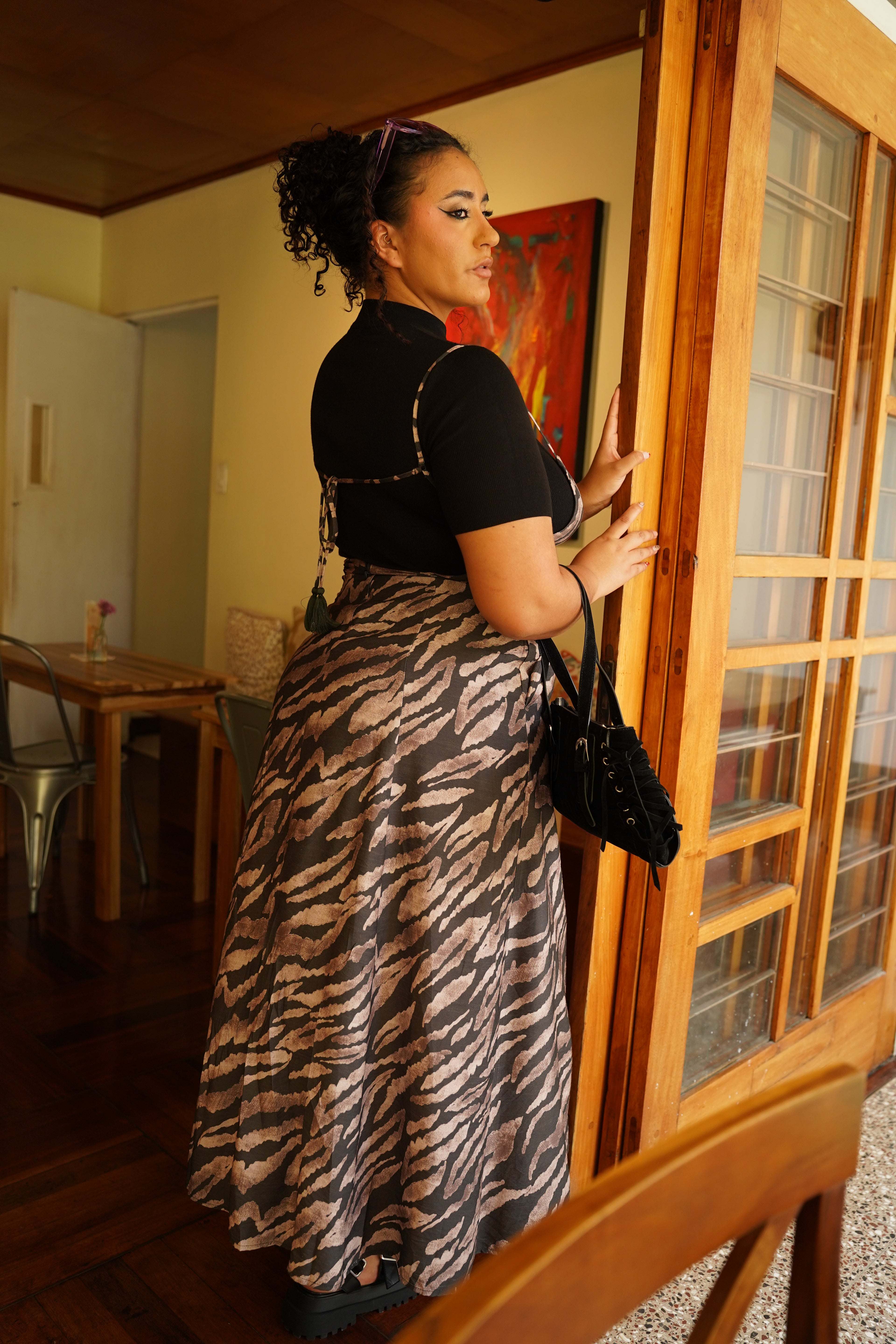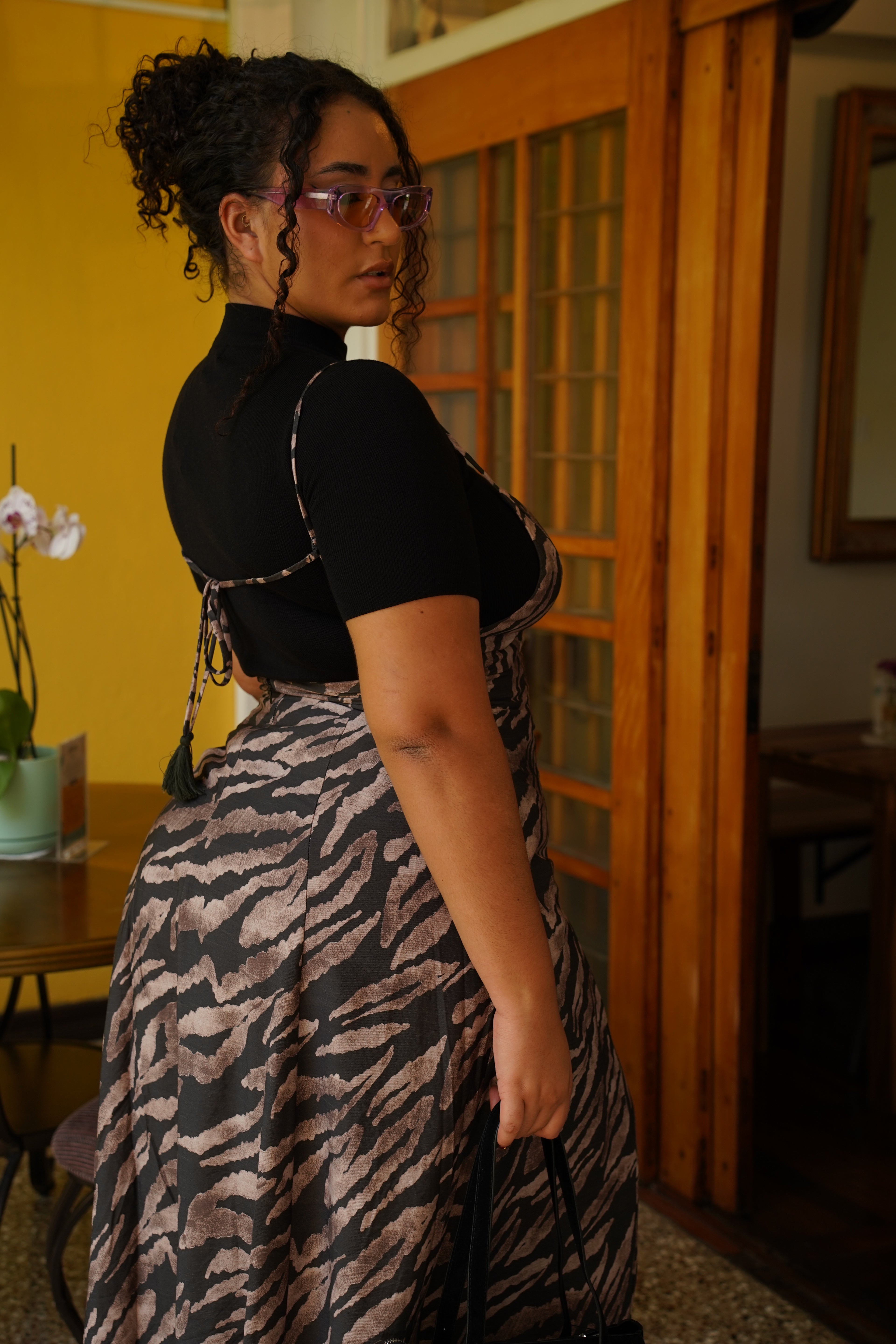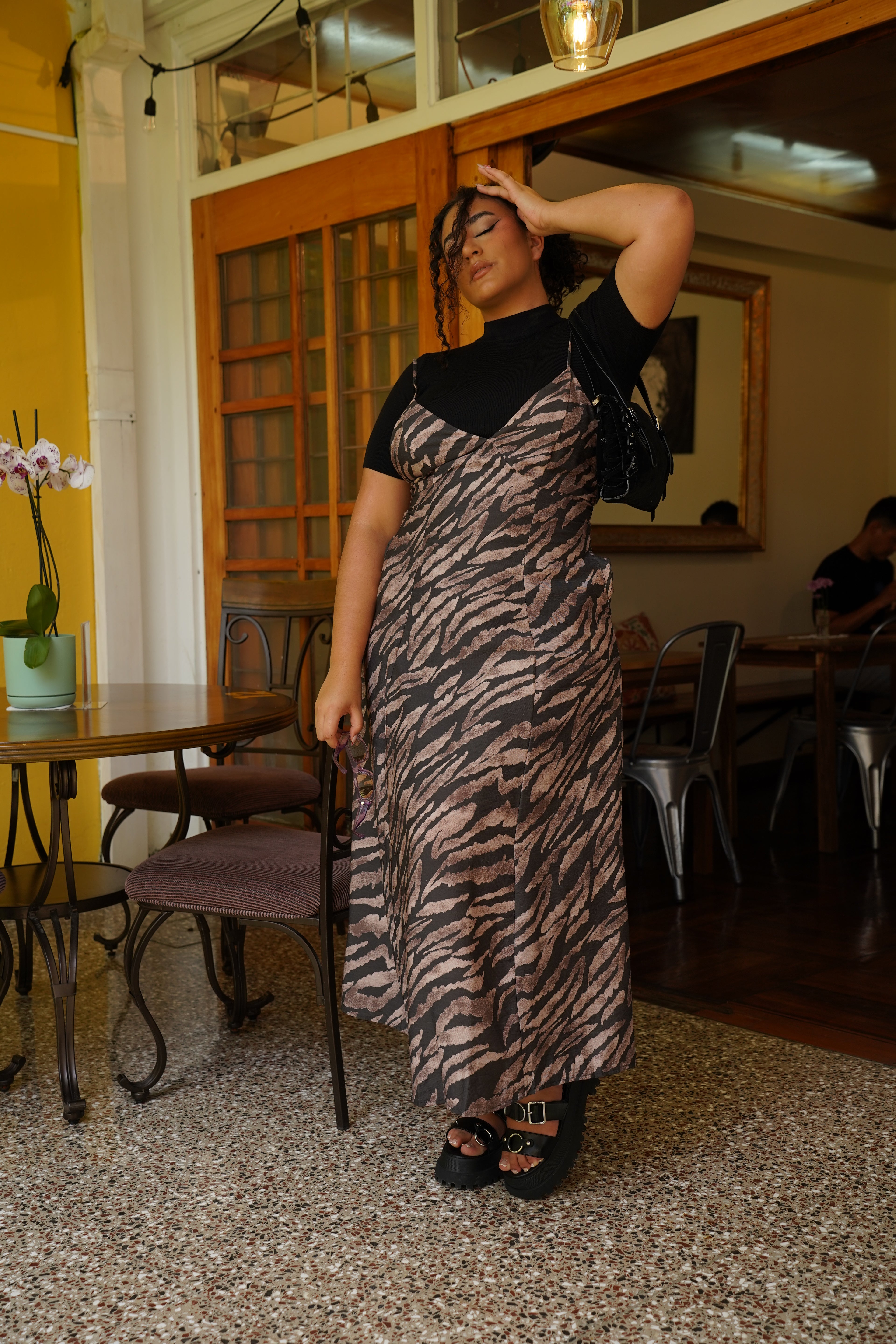 Vestido largo sin mangas con estampado animal. Tiene un escote en la espalda con amarre, bolsillos laterales y cierre invisible en la parte trasera. Totalmente forrado para mayor comodidad.