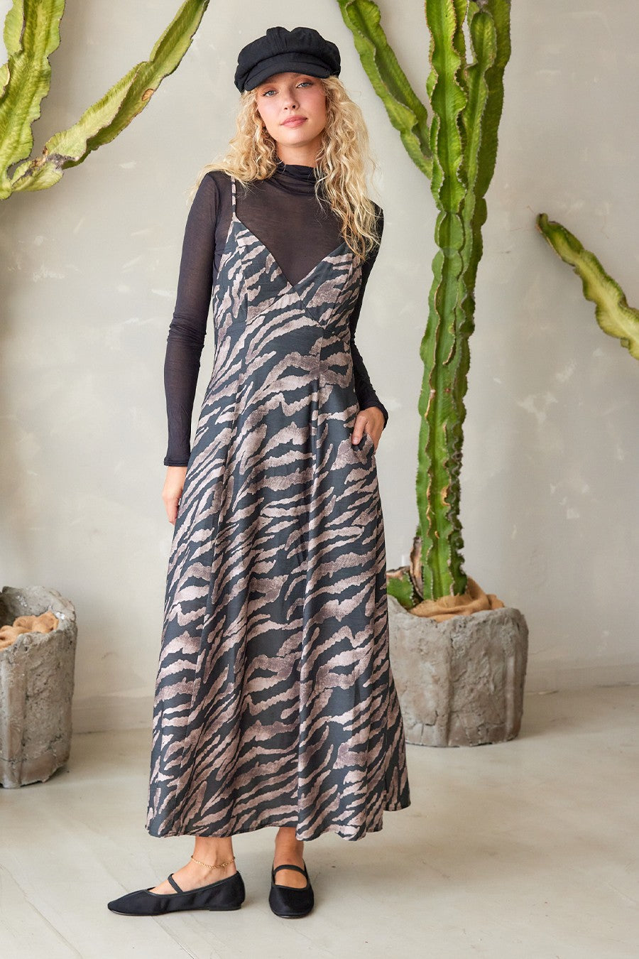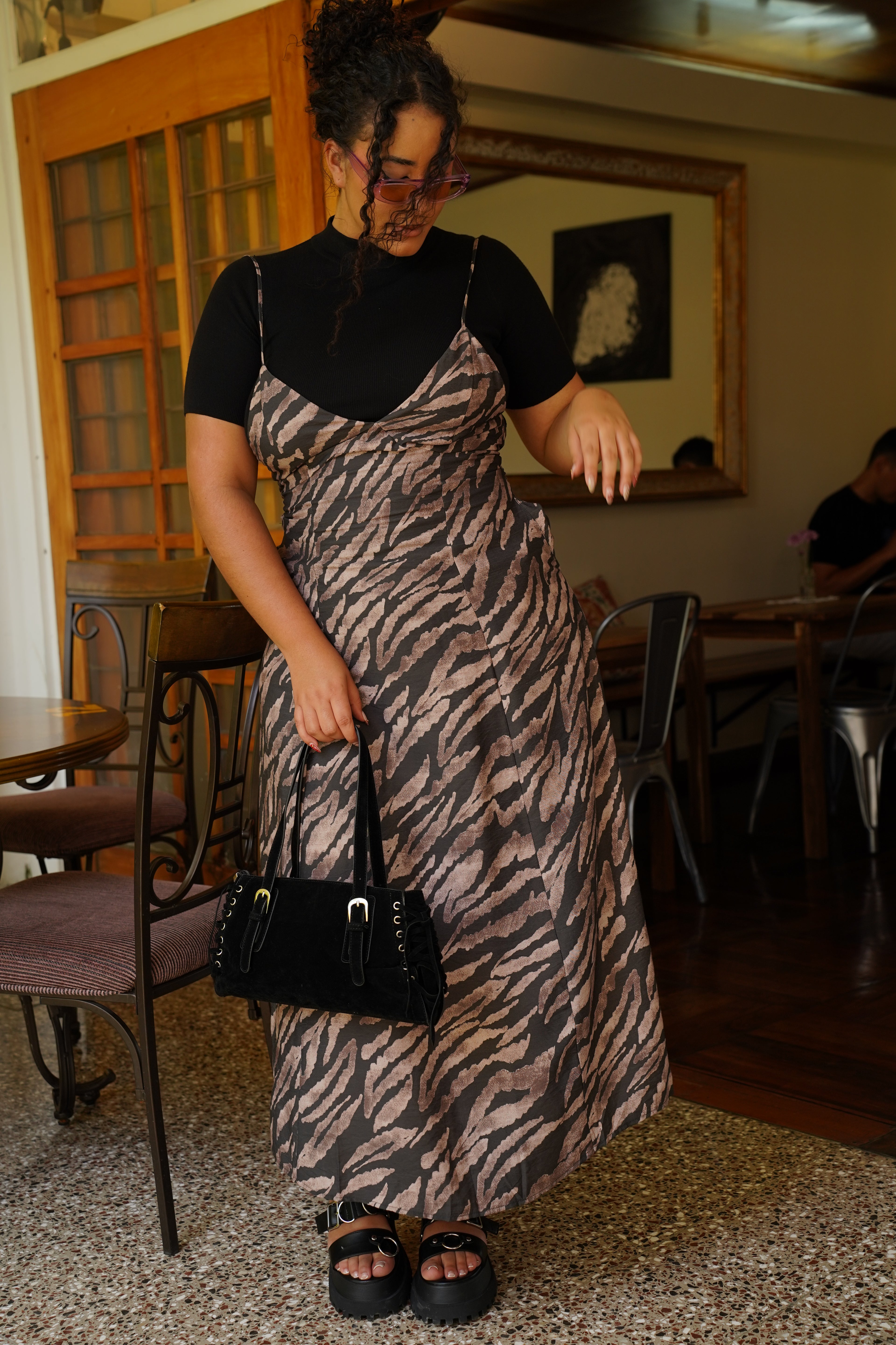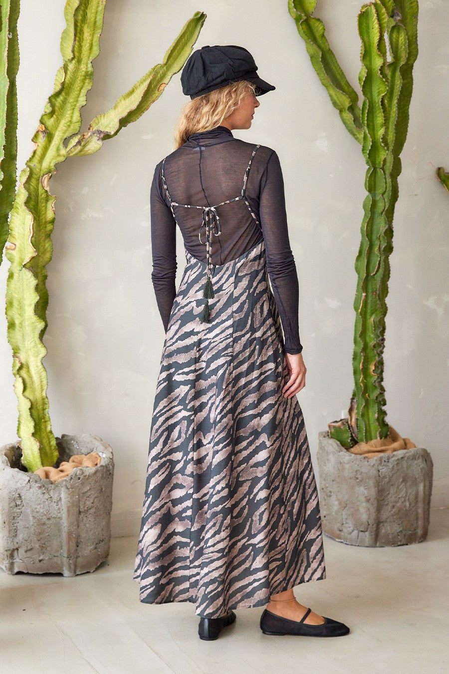 Vestido largo sin mangas con estampado animal. Tiene un escote en la espalda con amarre, bolsillos laterales y cierre invisible en la parte trasera. Totalmente forrado para mayor comodidad.