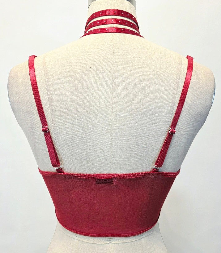 Top cropped de encaje con diseño halter y efecto criss cross al frente que realza la silueta con un toque femenino y moderno. Sus tirantes ajustables permiten un mejor fit, mientras el detalle de pedrería aporta un brillo sutil y sofisticado. Ideal para crear looks llamativos y estilizados, ya sea en capas o como pieza protagonista.